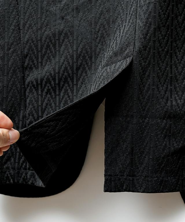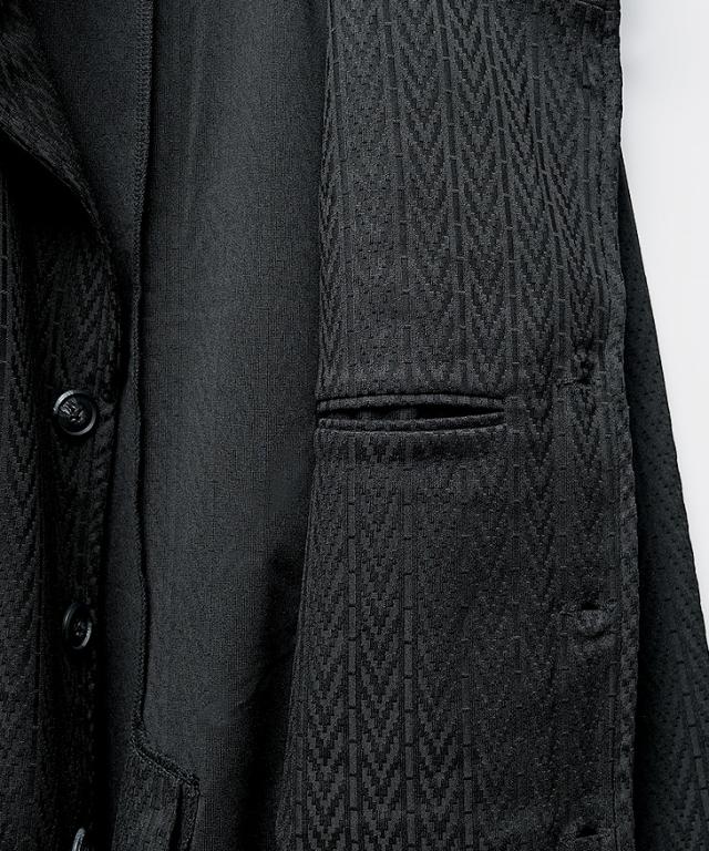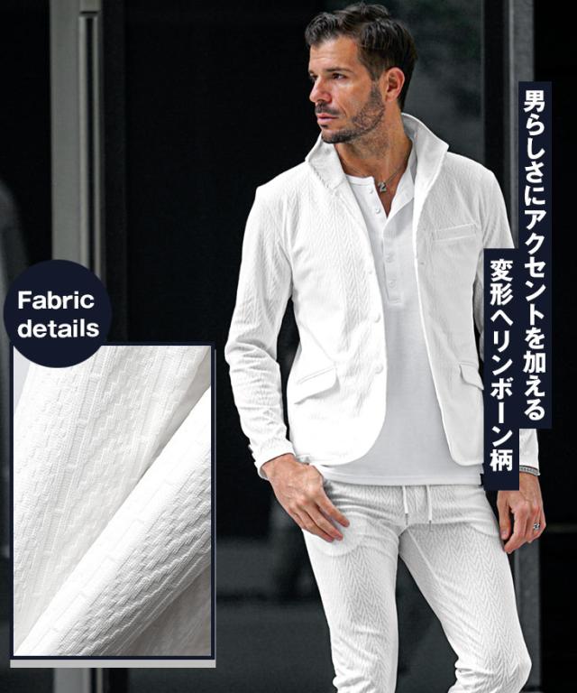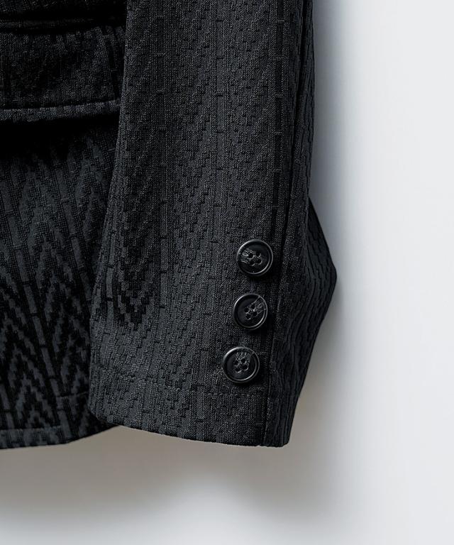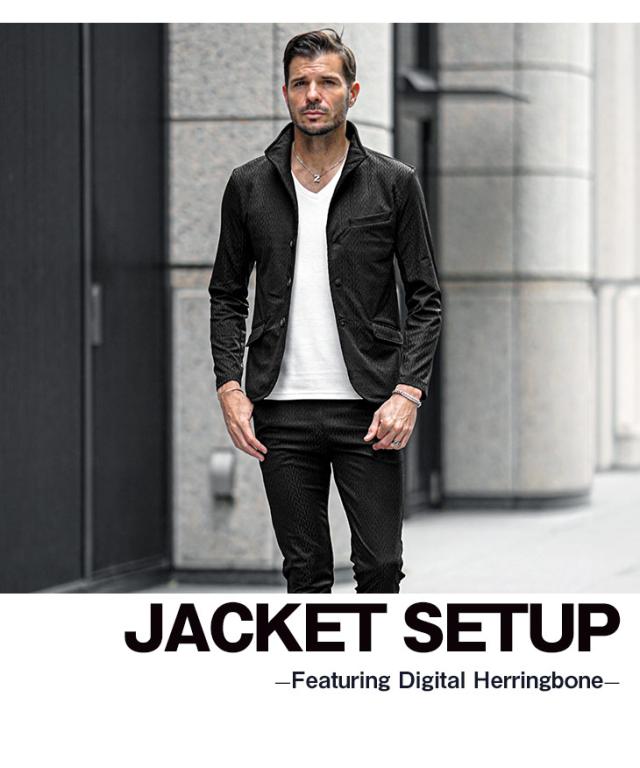 洗練された遊び心を纏う『デジタルヘリンボンセットアップ』【デジタルヘリンボンセットアップ】■ Design / デザイン光沢感のある素材と繊細なヘリンボン柄が織りなす、上品かつ印象的なセットアップ。シンプルながらも奥行きのあるデザインは、特別なシーンでも日常でも、自然と装いに品と存在感を添えてくれます。ジャケットは襟を立たせられる仕様で、柔らかな雰囲気にさりげない男らしさをプラス。アンクル丈のパンツは軽快な印象を与えつつ、足元のバランスを美しく見せてくれる絶妙なシルエット。上下ともに単品使いでも存在感を放ち、手持ちのアイテムとの相性も抜群。