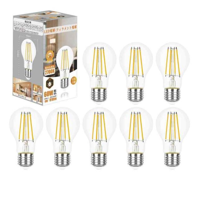 フィラメント電球 ミニクリプトン電球 LED電球 電球色 全方向タイプ クリア電球 省エネ (E26-810lm-8個入)