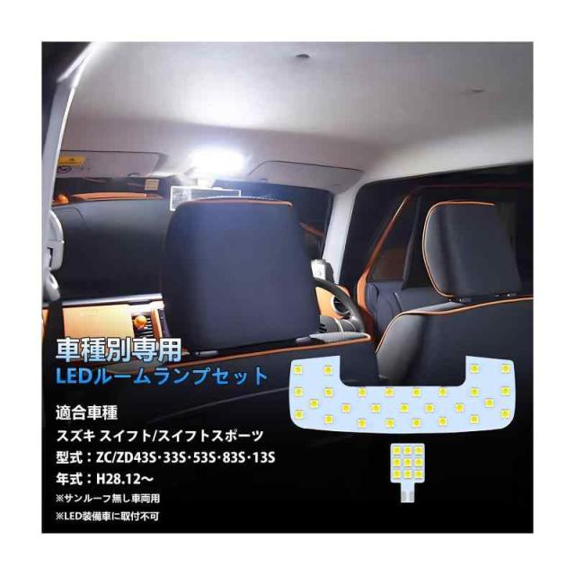 製品情報:LED ルームランプ セット 【適合車種】: スズキ スイフト/スイフトスポーツ ZC13S / ZC43S / ZC53S / ZD53S / ZC83S / ZD83S / ZC33S H28.12~ 専用、サンルーフ無し車両用、LED装備車に取付不可。【発光カラー】ホワイト 6000K 【ルームランプセット内容】:フロントルームランプ×1、ラゲッジランプ×1、全2点。