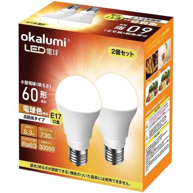 ?【商品仕様】対応口金:E17(口金直径17mm)、電球サイズ:Φ35*71mm(白熱電球とほぼ同じサイズ)、定格消費電力:5.3W(60W形相当)、全光束(明るさ):730lm、定格電圧:100V 50/60Hz共用 、色温度:2700K 電球色相当、配光角:約360°(全方向タイプ)、演色性:Ra?83。注意:調光器対応:X