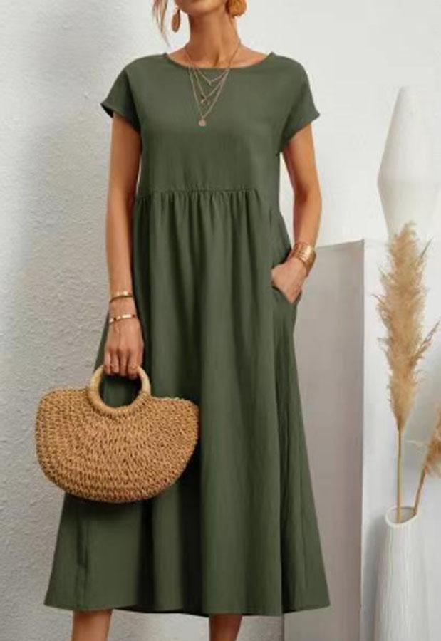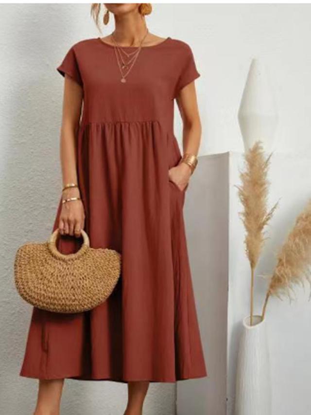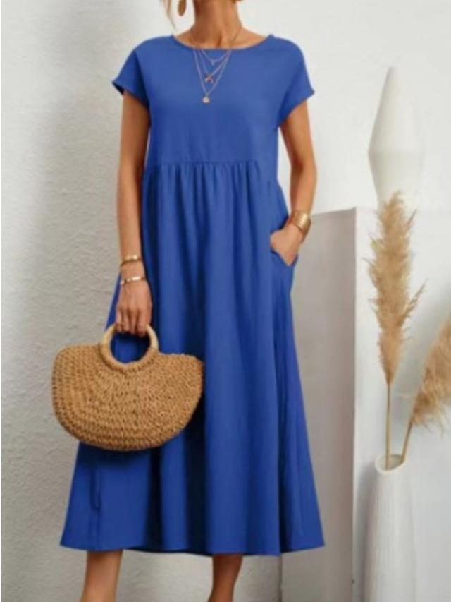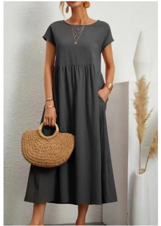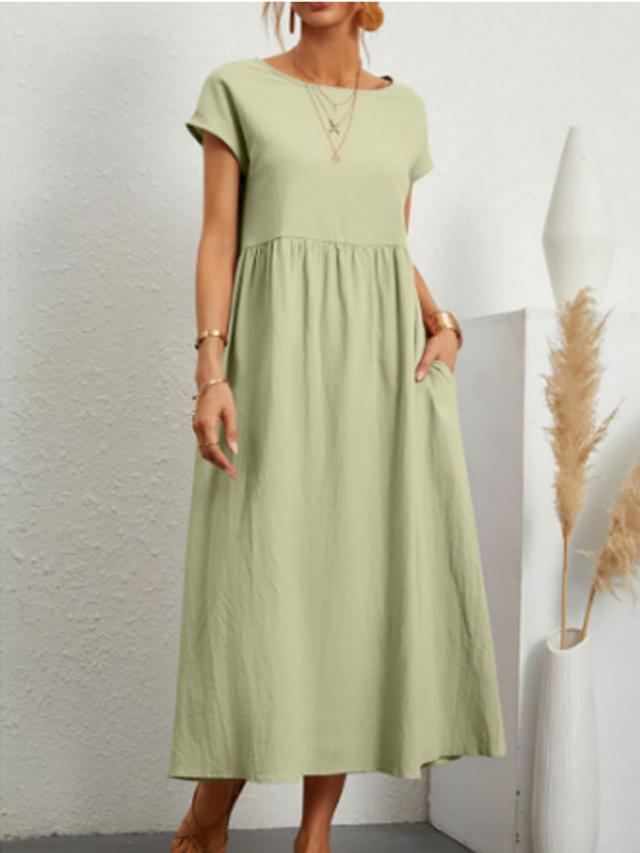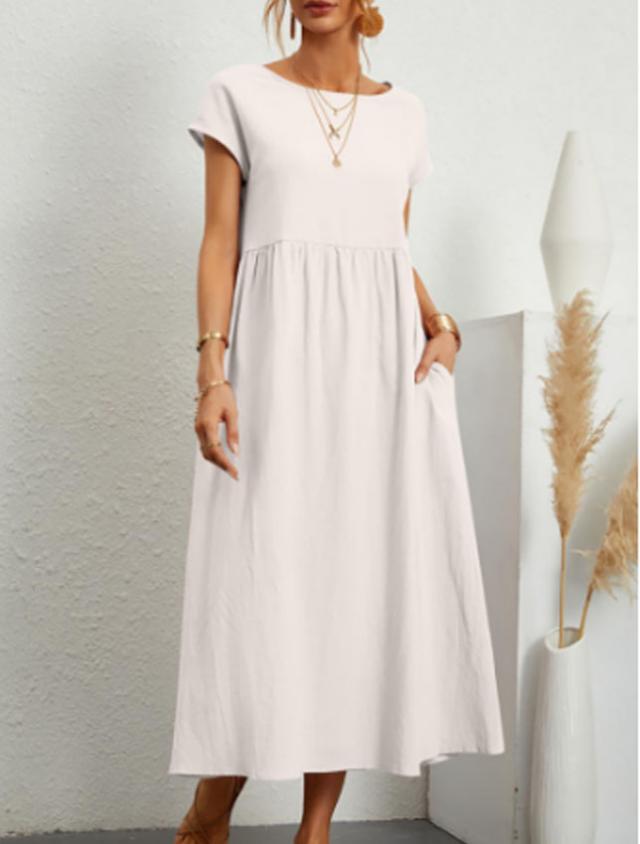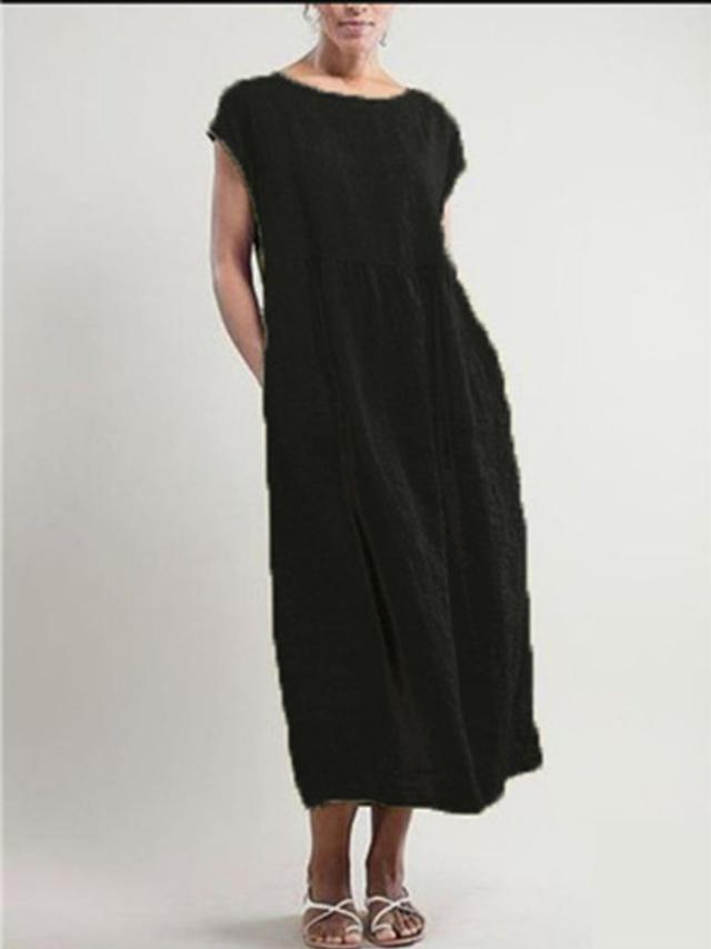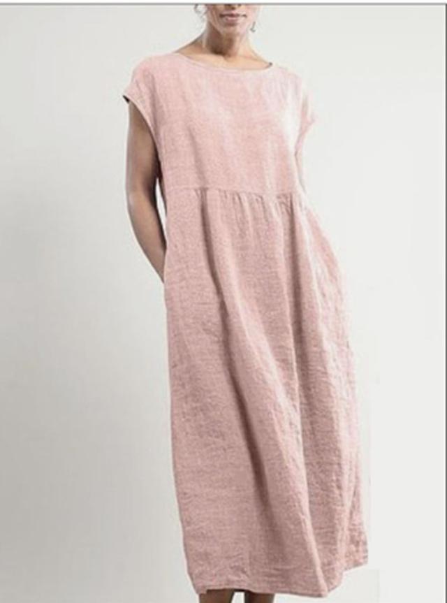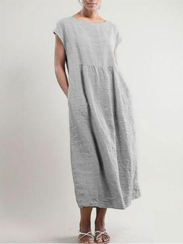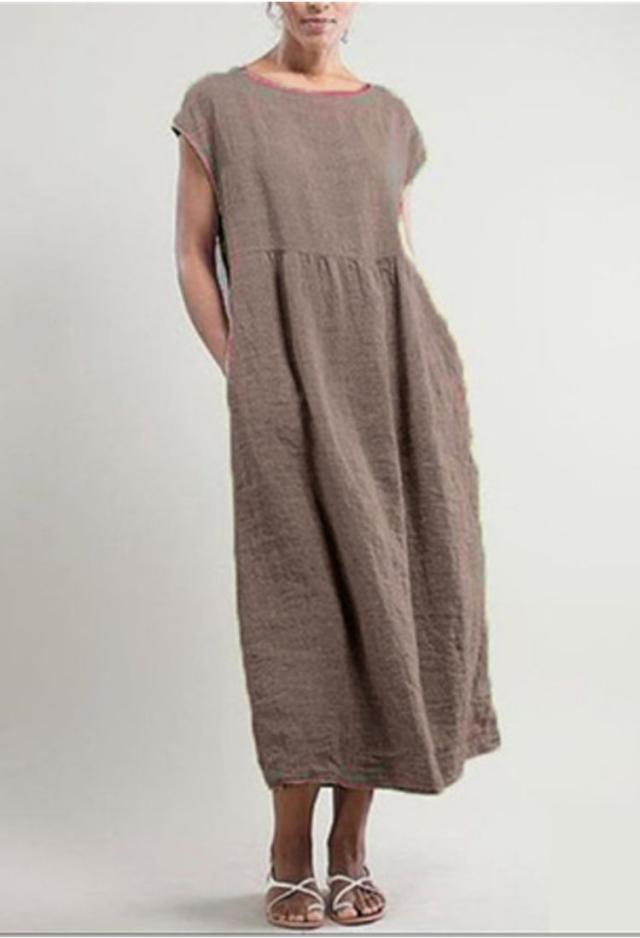 ワンピース リネン 半袖 綿麻 ロングワンピース レディース ロング丈 マキシ丈 Uネック 無地 体型カバー ゆったり ゆるっとワンピース シンプル 大きいサイズ 楽ちん お出かけ 涼しい 春 夏