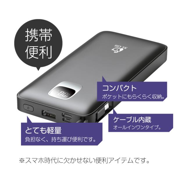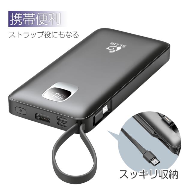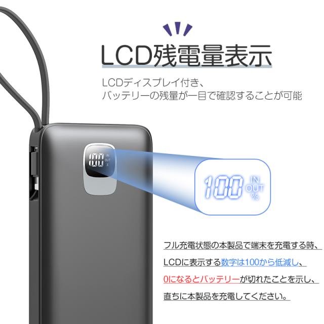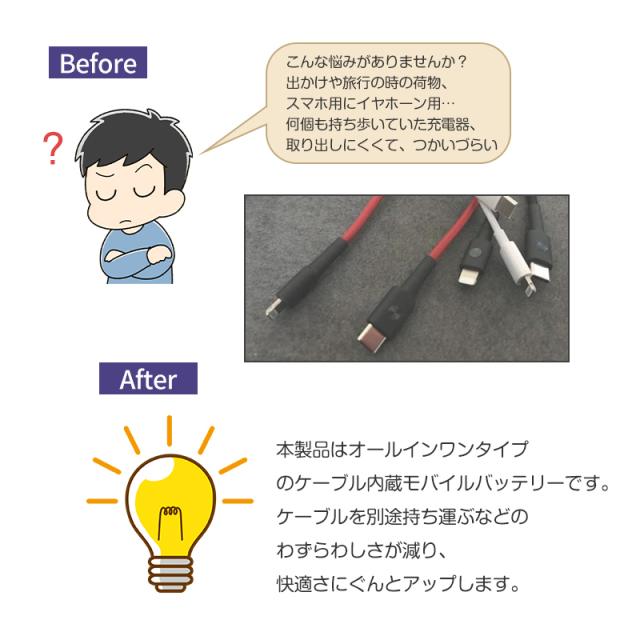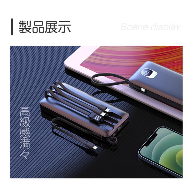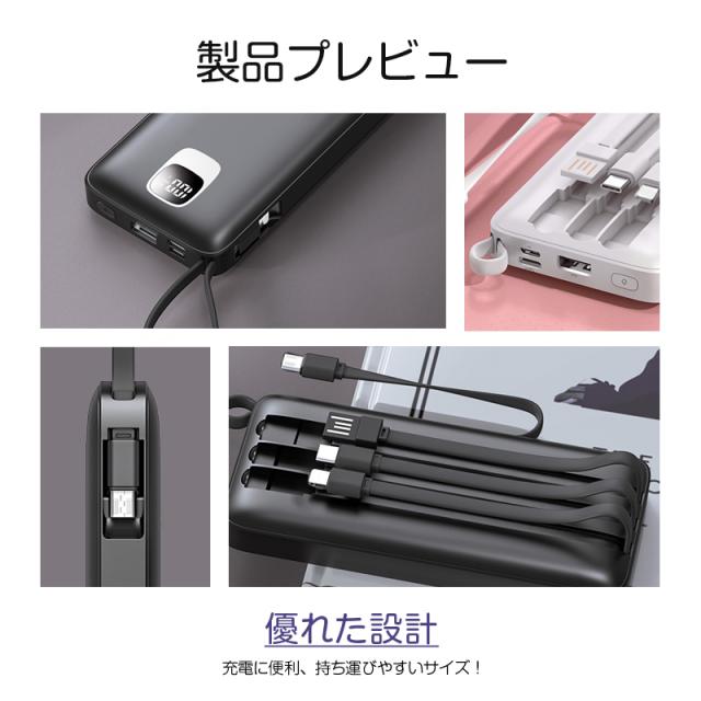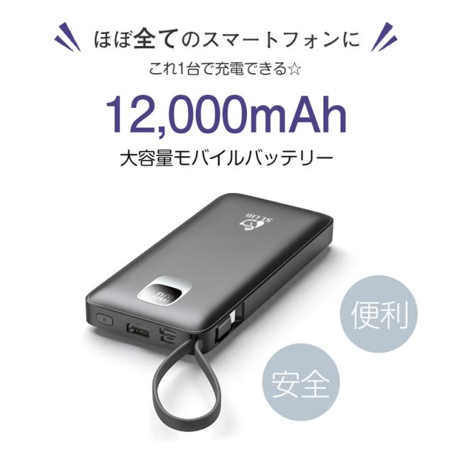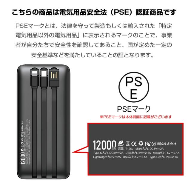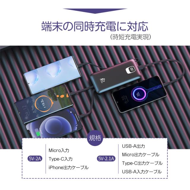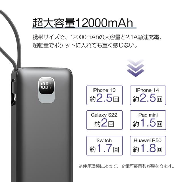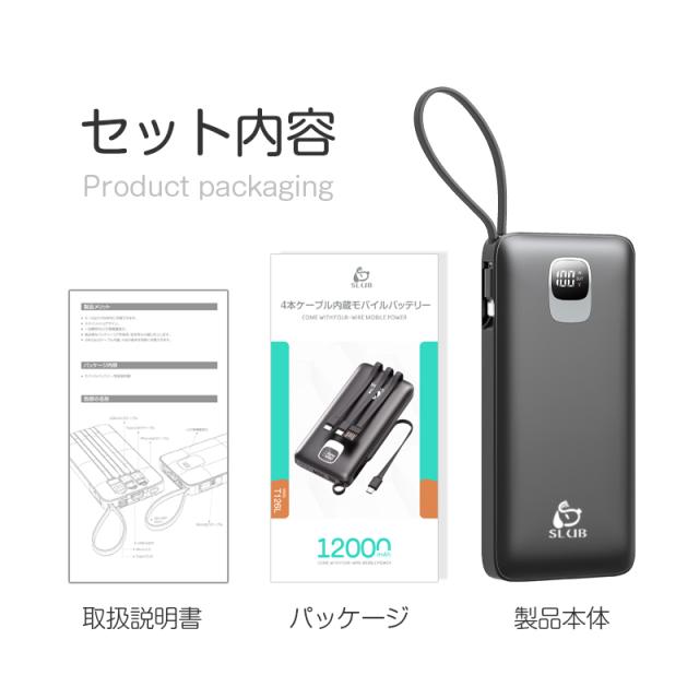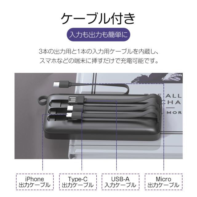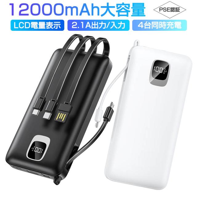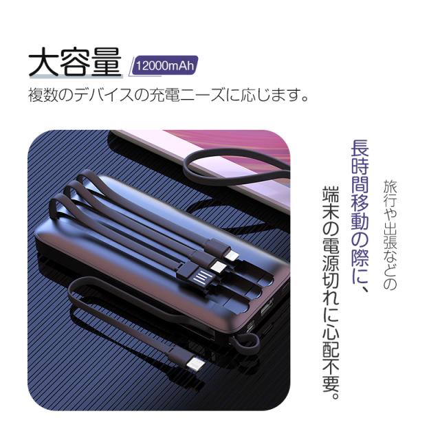 モバイルバッテリー大容量 ケーブル内蔵 iPhone Type-C Micro USB 12000mAh 4台同時充電可能 急速充電 ケーブル不要 スマホ充電器 防災グッズ 防災用品 地震 災害 PSE認証済 iPhone iPad Android 対応 機内持ち込み 出張 旅行