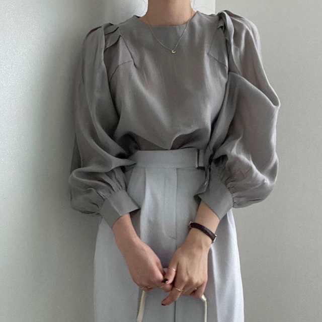 【ポイント10倍!】パフスリーブブラウス レディーストップスシャツ 長袖 春夏服 透け感 丸首 フリル プルオーバー 長袖ブラウス シャツブラウス オフィス 大人 卒業式 入学式 20代