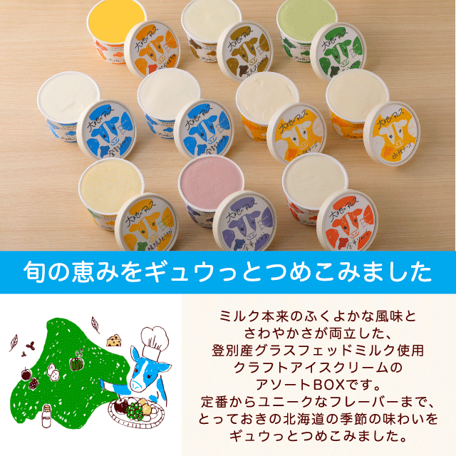 ミルク本来のふくよかな風味とさわやかさが両立した登別産グラスフェッドミルクを使用したクラフトアイスクリームのアソートBOXです。
