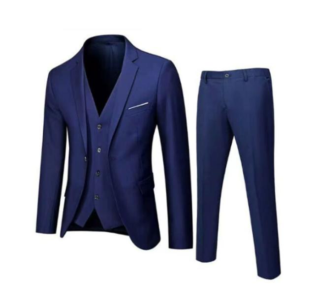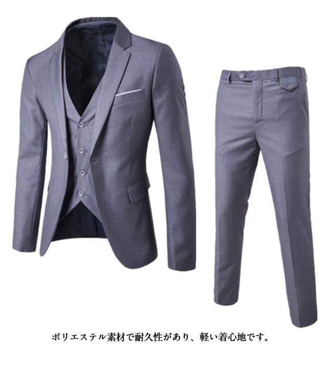 | 全10色×9サイズ!メンズ用シンプルなスーツ3点セット。【ジャケット+ベスト+ズボン】 ノーネクタイでも誠実な印象を与える、シンプルなセットアップです。 ポリエステル素材で耐久性があり、軽い着心地です。 ビジネスはもちろん、カジュアル、ゴルフや旅行に一着あると重宝する、人気のスーツです! | |