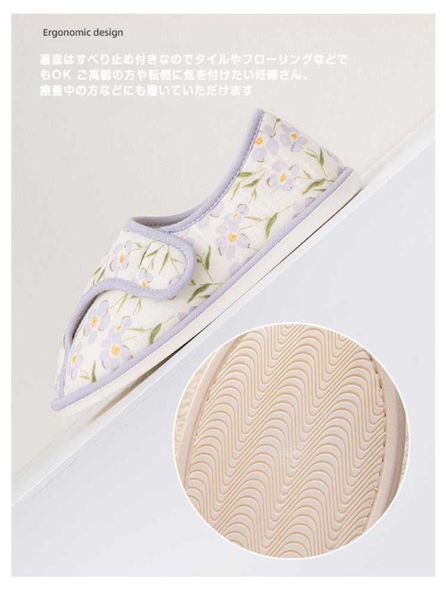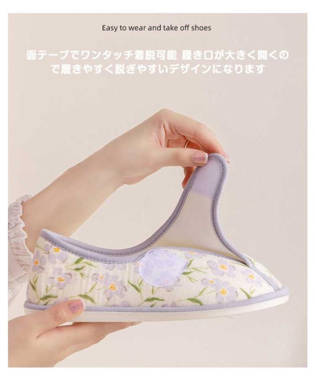 | 面テープでワンタッチ着脱可能 履き口が大きく開くので履きやすく脱ぎやすいデザインになります 裏底はすべり止め付きなのでタイルやフローリングなどでもOK ご高齢の方や転倒に気を付けたい妊婦さん、療養中の方などにも履いていただけます リビング用やキッチン、トイレなどのおうち用としてや、介護・リハビリや入院用のルームシューズ。 妊娠中、産後の室内用。底面は滑り止め衝撃吸収ソールとなっています。 | |
