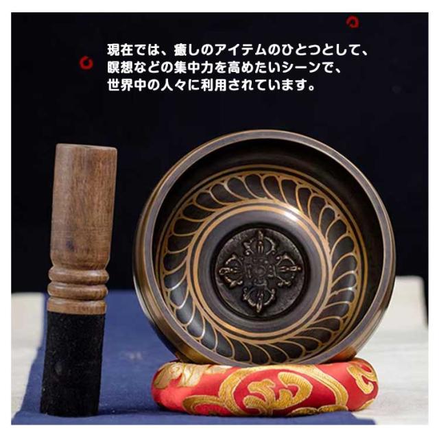 | シンギングボウルとは、スティックを用いふちをこすったりたたくことで音を出す器です。 タップやボウルの縁の周りに弾くと、それは純粋な、平和な心を落ち着かせる、リラックス音を作成します。 宗教練習、深い瞑想、リラクゼーション、ヘルスケア、ヨガイベントなどに最適です。 ストレス障害、痛み、うつ病の治癒を促進し、心身のバランスが調和され、爽やかな一日がスタートできます。 現在では、癒しのアイテムのひとつとして、瞑想などの集中力を高めたいシーンで、世界中の人々に利用されています。 シンギングボウルを楽器として使いたい人や、シンプルなデザインが好きな方にお勧めです。 | |