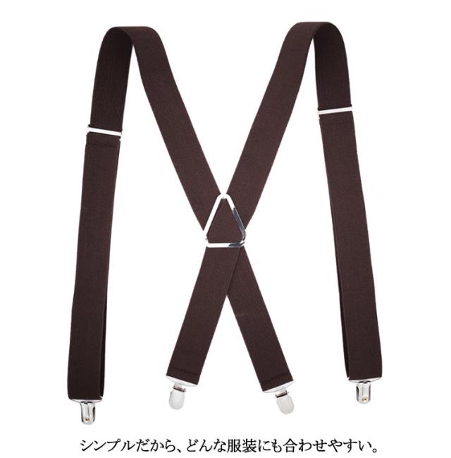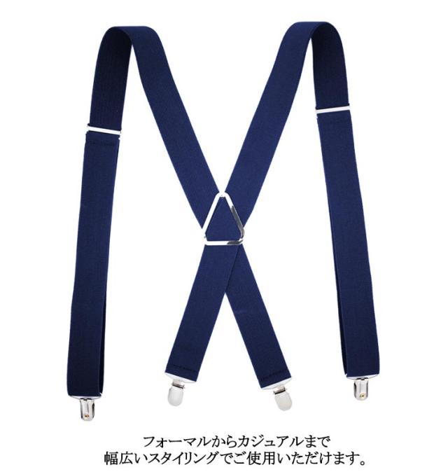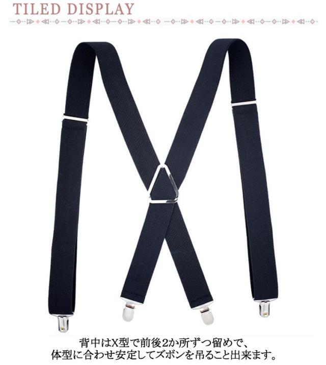 | 幅3.5×長さ120cm ずり落ち防止はもちろん、ファッションのアクセントとしてもおしゃれなサスペンダー。 背中はX型で前後2か所ずつ留めで、体型に合わせ安定してズボンを吊ること出来ます。 ベルトと違い腰周りの締めつけもなく、リラックスしながらお洒落な印象を周囲に与えるオススメアイテムです。 シンプルだから、どんな服装にも合わせやすい。 フォーマルからカジュアルまで幅広いスタイリングでご使用いただけます。 | |