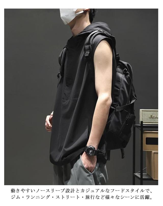 トップス フード付きベスト ノースリーブパーカー 夏用 スポーツ タンクトップ パーカー メンズ ノースリーブパーカー ジムウェア 吸汗速乾 大きいサイズ 黒 20代 30代