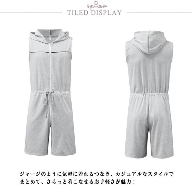 | ノースリーブ フード付きオールインワン! ジャージのように気軽に着れるつなぎ、カジュアルなスタイルでまとめて、さらっと着こなせるお手軽さが魅力! | |