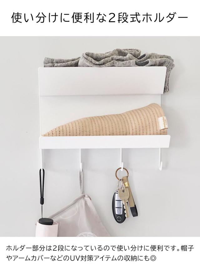 スチール製の玄関扉などにマグネットで簡単に取り付けできる、フック付き手袋ホルダー。置き場所に困りがちな手袋の定位置をつくれます。玄関扉は、外出時は靴を履いたあとにサッと手に取れ、帰宅時もすぐに外してその場で収納できる、手袋収納におすすめの場所。目につきやすい場所なので、お出かけ時の忘れ物防止にもなります。ホルダー部分は使い分けに便利な2段式で、手袋が取り出しやすいよう斜めに設計されています。帽子やアームカバーなどのUV対策アイテムの収納にも◎ フック部分は奥行きがある形状で、ペットのお散歩アイテムや鍵などの小物を掛けやすくなっています。お出かけ用品を一括収納できて便利です。