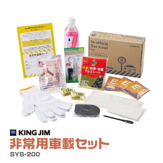 キングジム 非常用車載セット SNSで人気 TV紹介品 SYS-200 非常用持ちだし 車用災害対策セット 保存水 クッキー 備蓄氷糖 簡易トイレ ホイッスル 軍手 マスク アルミブランケット アイマスク ポケットティッシュ 連絡カード クリップペン 防災 緊急 避難 地震 賞味期限6年