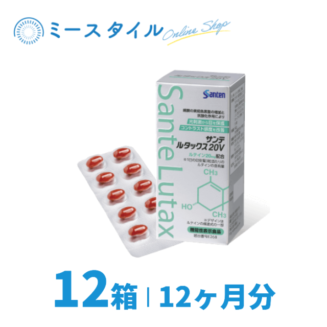サンテ ルタックス20V / 12個[名称]ルテイン含有加工食品[栄養成分]ルテイン 20mgゼアキサンチン 3mgビタミンC 300mgビタミンE 150mg亜鉛 15mg銅 1.2mg熱量 9.0kcalたんぱく質 0.44g脂質 0.60g炭水化物 0.47g[接種目安]1日3粒[原材料名]ゼラチン、サフラワー油、ビタミンE含有植物油、亜鉛酵母銅酵母、ビタミンC、グリセリン、グリセリンエステル、マリーゴールド色素、フィチン酸[内容量]90粒[賞味期限]製造月より3年間[保存方法]直射日光を避け、湿気の少ない涼しいところに保存してください【関連ワード】サプリメント