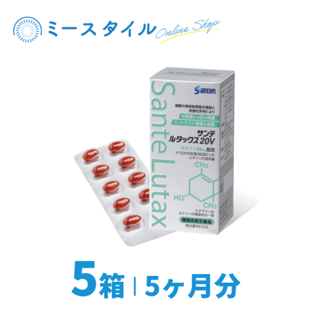 サンテ ルタックス20V / 5個[名称]ルテイン含有加工食品[栄養成分]ルテイン 20mgゼアキサンチン 3mgビタミンC 300mgビタミンE 150mg亜鉛 15mg銅 1.2mg熱量 9.0kcalたんぱく質 0.44g脂質 0.60g炭水化物 0.47g[接種目安]1日3粒[原材料名]ゼラチン、サフラワー油、ビタミンE含有植物油、亜鉛酵母銅酵母、ビタミンC、グリセリン、グリセリンエステル、マリーゴールド色素、フィチン酸[内容量]90粒[賞味期限]製造月より3年間[保存方法]直射日光を避け、湿気の少ない涼しいところに保存してください【関連ワード】サプリメント