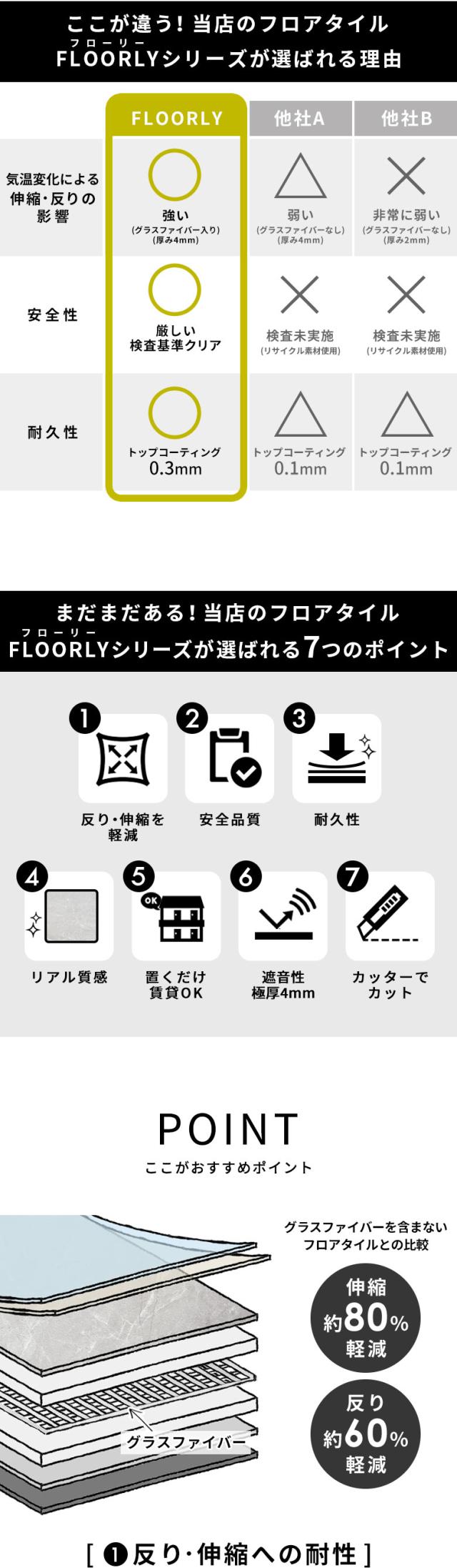 グラスファイバーなしのフロアタイルに比べて