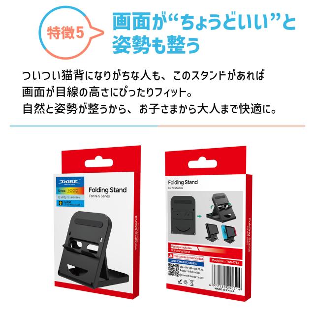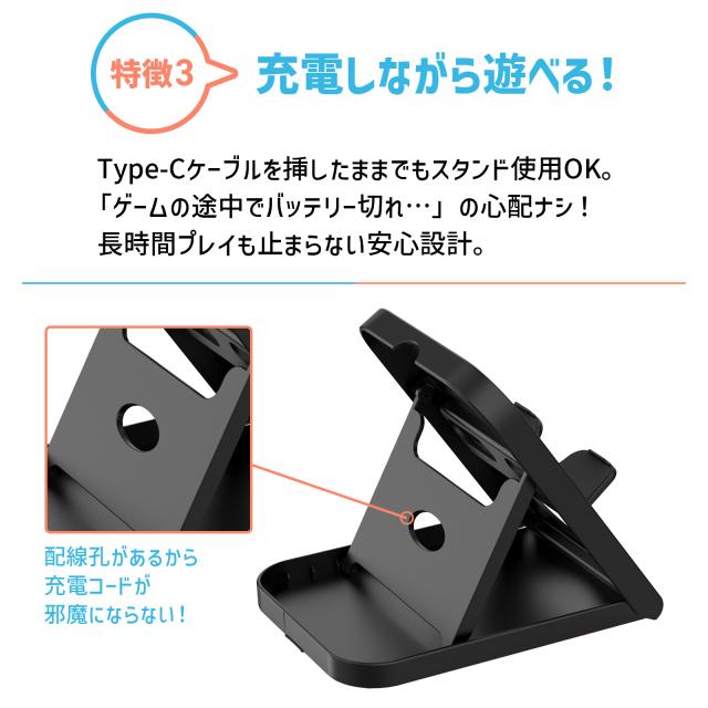 | 特徴 | 【 自分の好きな角度に調整できるから、長時間でも疲れません。 】 【 優れた5つの特徴 】 (1) 好きな角度に調整できて長時間プレイもラクラク (2) 折りたたみ式でカバンに入れて持ち運びもカンタン (3) 充電しながら遊べてバッテリー切れの心配ナシ (4) 滑り止め付きで安定感バツグン、ズレずに安心 (5) 画面がちょうどいいと姿勢も整う 【 好きな角度に調整できて長時間プレイもラクラク 】 角度自由で姿勢もラクラク! 角度を細かく調節できるから、見やすくて肩もラク!ゲームも動画も自分に合った姿勢で楽しめます。 【 折りたたみ式でカバンに入れて持ち運びもカンタン 】 パタンとたためてどこでも持ち運びOK! 折りたたんでカバンにすっぽり入るから、外出先でも大活躍!旅行や帰省にもぴったりのスタンドです。 【 充電しながら遊べてバッテリー切れの心配ナシ 】 遊びながらそのまま充電! Type-Cケーブルを挿したまま使えるので、ゲーム中にバッテリーがなくなる心配がありません! 【 滑り止め付きで安定感バツグン、ズレずに安心 】 ズレない安心!しっかり固定 底面と接地面にゴムの滑り止め付き!机の上でもしっかり固定され、子どもがさわってもズレにくい! 【 画面がちょうどいいと姿勢も整う 】 ついつい猫背になりがちな人も、このスタンドがあれば画面が目線の高さにぴったりフィット。 自然と姿勢が整うから、お子さまから大人まで快適に。 |