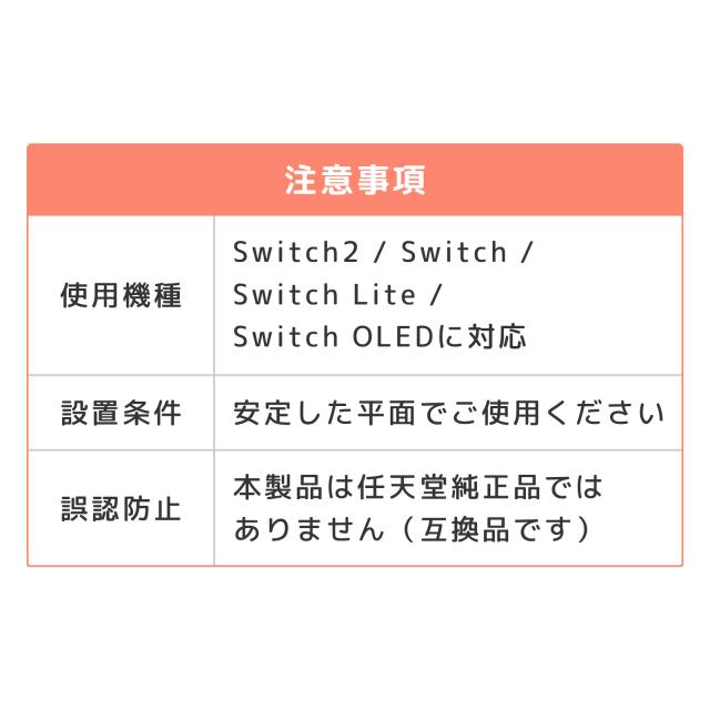 ※機種本体は見本に付き付属しておりません。 ※本製品は中古ではなく新品 未使用です。 ※MY WAY ( マイウェイ ) FIRME ブランド登録済み製品です。 ※Switch2 / Switch / Switch Lite / Switch OLEDに対応 ※安定した平面でご使用ください ※本製品は任天堂純正品ではありません(互換品です) |
