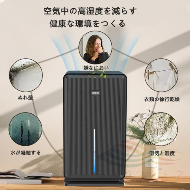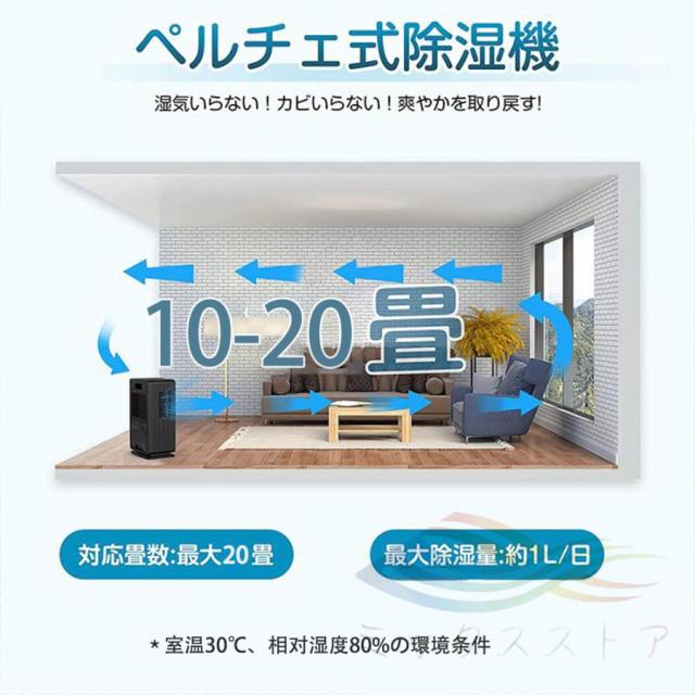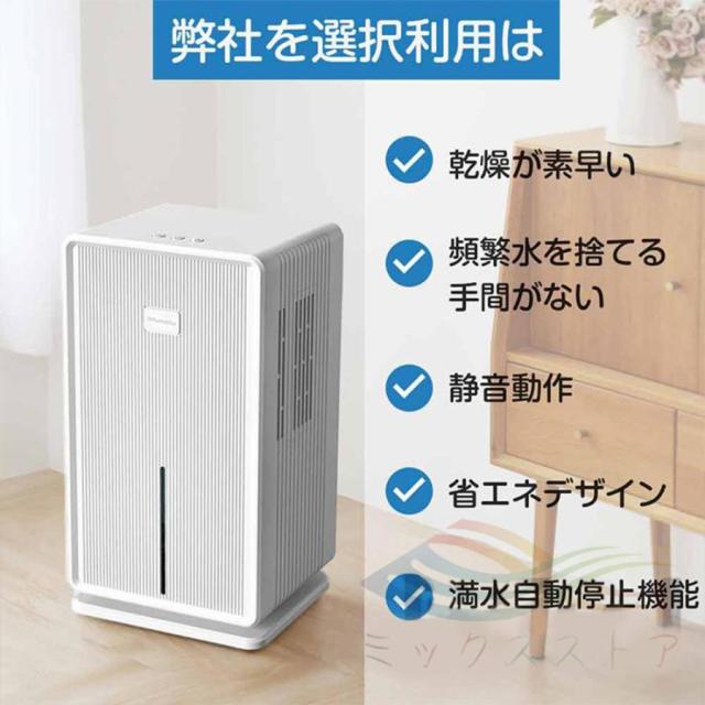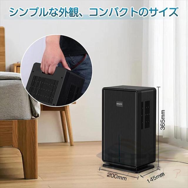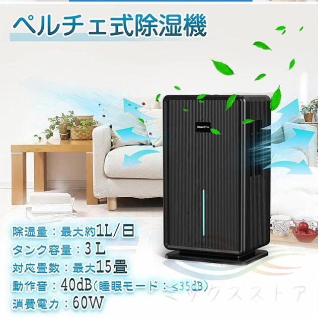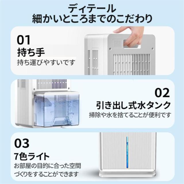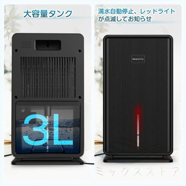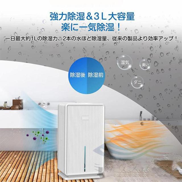 最新型除湿器、3L大容量タンクが搭載され、一日最大約1Lの強力除湿力(30℃/80%)、従来製品より効率アップで、梅雨、雨季、湿度高い夏の室内など場合、カビ、家の湿気除湿対策、結露対策、梅雨対策として大活躍!過湿で起こる問題が解決可能で、カビ、ダニなど生えやすい過湿環境から解放!こまめに水を捨てに行く手間がかからなくて便利で快適。