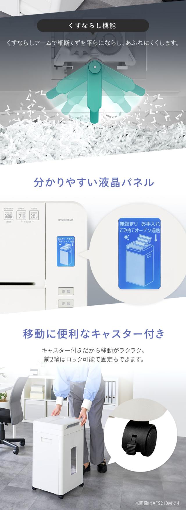 シュレッダー アイリスオーヤマ オフィス 静音 自動 電動 マイクロクロスカット 業務用 会社 書類 個人情報 大容量 37L キャスター付き 最大細断 A4 7枚 最大給紙 210枚 オートクリーニング くずならし機能 除電 シュレッター AFS260M *