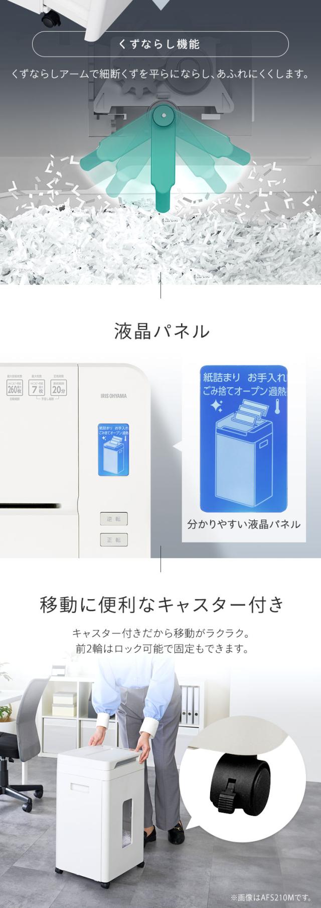 シュレッダー アイリスオーヤマ オフィス 静音 自動 電動 マイクロクロスカット 業務用 会社 書類 個人情報 大容量 37L キャスター付き 最大細断 A4 7枚 最大給紙 210枚 オートクリーニング くずならし機能 安心延長保証対象 AFS260M *