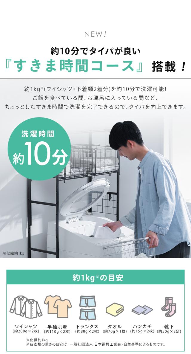 単身者2日分の衣類(化繊約1kg)を約10分で洗濯可能!