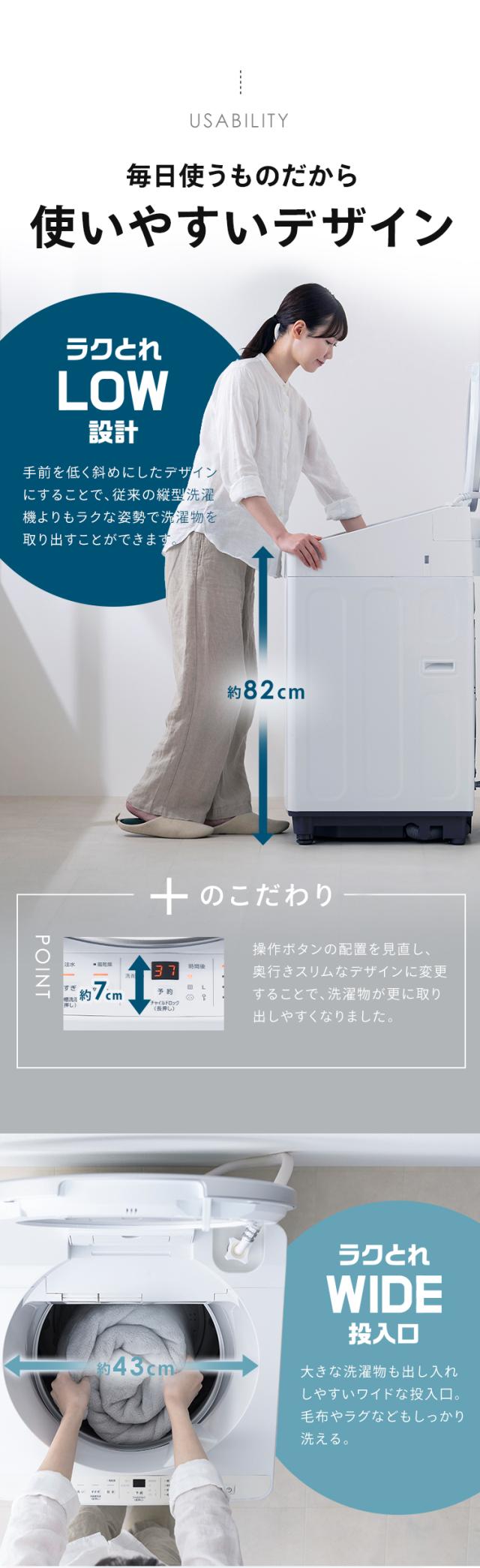 手前を低く斜めにしたデザインにすることで、従来の縦型洗濯機よりもラクな姿勢で洗濯物を取り出すことができます。