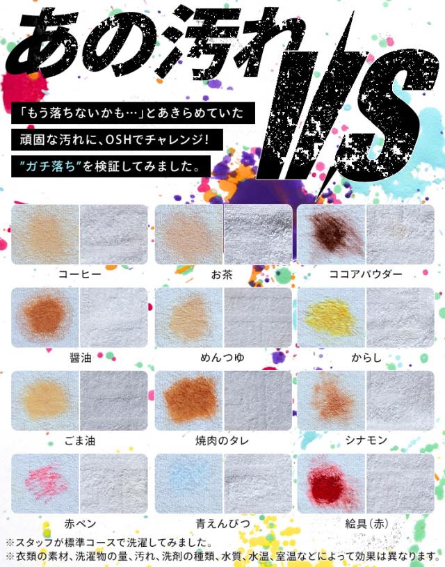 衣類にこびりついたガンコな油汚れやシミ汚れもガチにしっかり落とします。