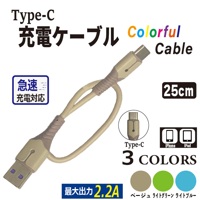 【 3本購入で+1本プレゼント! 】 Type-C 急速 充電 ケーブル 25cm 2.2A PVC android スマホ 【商品レビュー記入で ポイント 10% 還元】