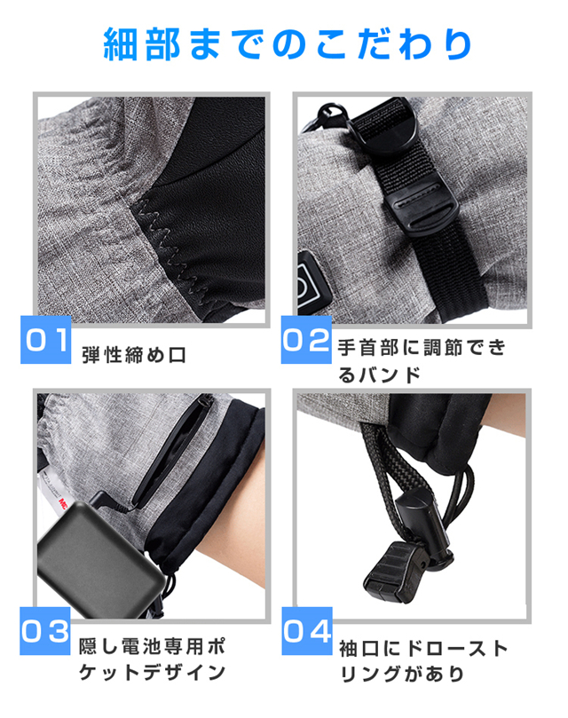 ・ヒーター発熱繊維を指の外周に沿って配置し、手をポカポカと温めてくれます。