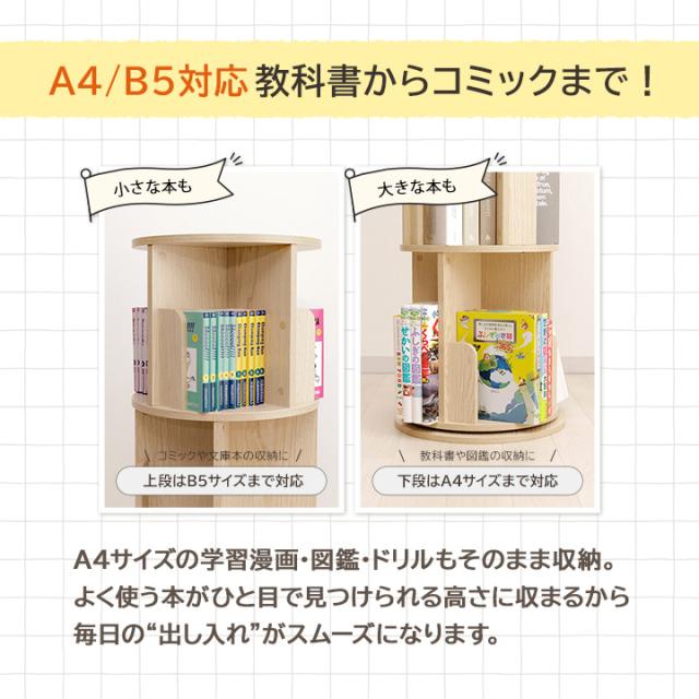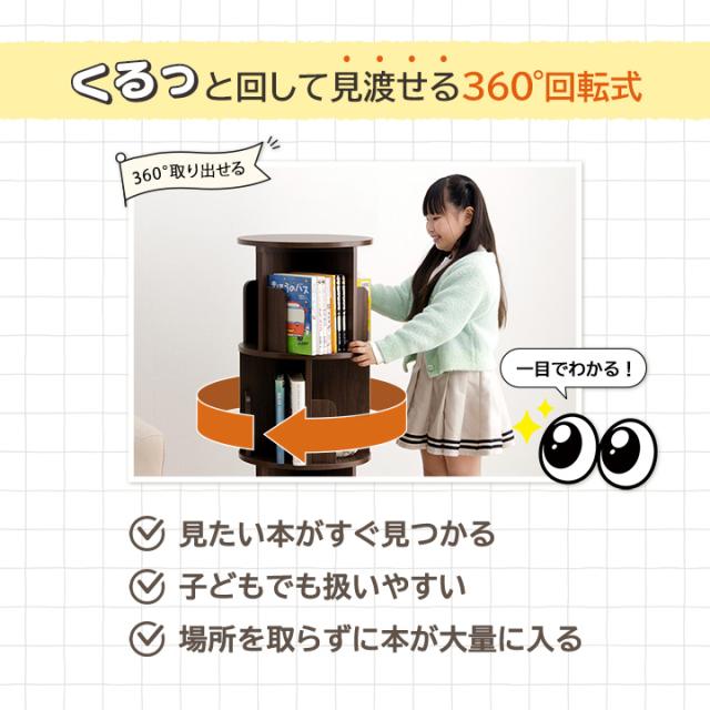 | ●回転式構造により、狭いスペースでも大量の本を収納可能。 ●最大で約200冊の文庫本が収納できる(棚の種類によって異なる)。 ●A5判やコミック、文庫、新書など多様なサイズに対応。 ●回転機構は、静音性と操作性を両立。 ●小さな力でも片手でラクに回転可能。 ●木目調の落ち着いたデザインで、どんな部屋にもなじむ。 ●ドライバー1本で簡単に組み立て可能。 ●子ども部屋やリビング、書斎など多用途対応 |