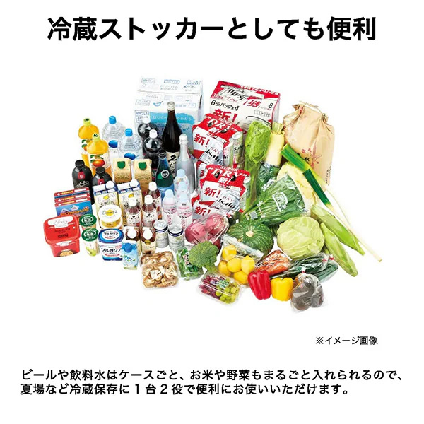 ビールや飲料水はケースごと、お米や野菜もまるごと入れられるので夏場など冷蔵保存に1台2役で便利にお使いいただけます。