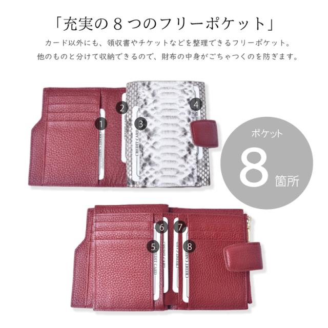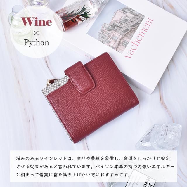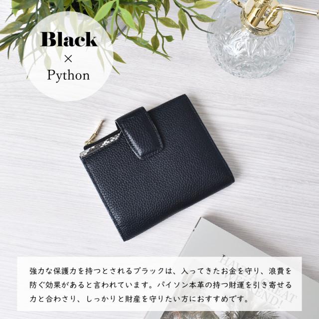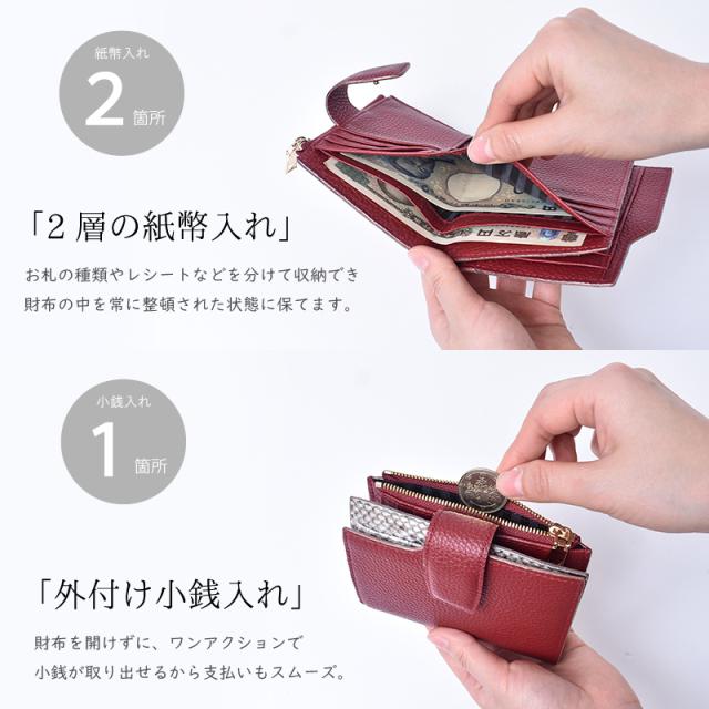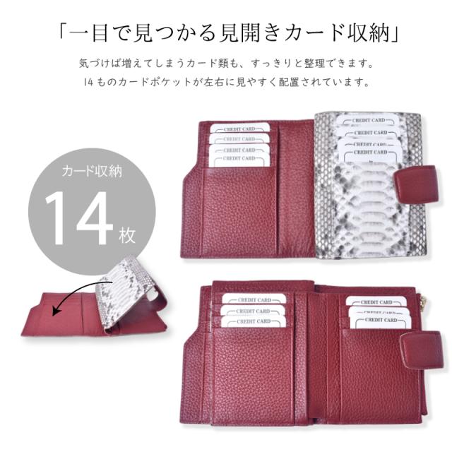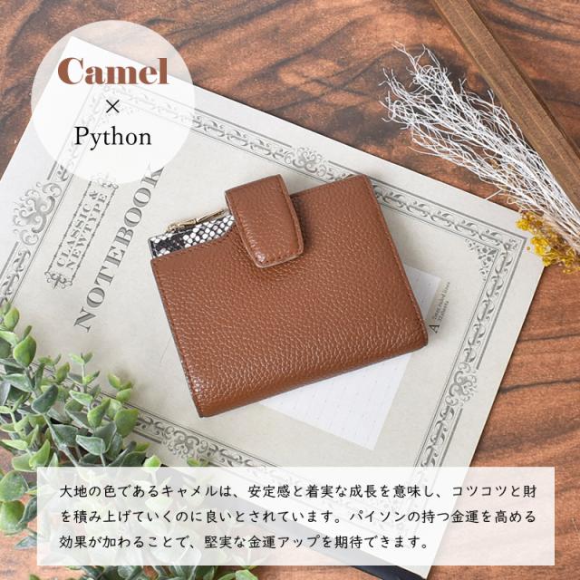 「チラリと見えるパイソン」 外見は落ち着いた印象の牛革を使用しながら、内側には大胆なパイソンレザーを配することで、持つ人にだけわかる個性を演出します。 「目を引く、内側のパイソン本革」 滑らかでしなやかな手触りでありながら、耐久性にも優れているのが特徴です。 美しい鱗模様は、一つひとつ異なる表情を持っています。 「大人のための上質な牛革」 シボがあることで革の表面に豊かな表情と奥行きが生まれ、使い込むほどに深みを増します。 傷や汚れが目立ちにくいという実用的な利点も◎ 「ワイン×パイソン」 深みのあるワインレッドは、実りや豊穣を象徴し、金運をしっかりと安定させる効果があると言われています。 パイソン本革の持つ力強いエネルギーと相まって着実に富を築き上げたい方におすすめです。 「ブラック×パイソン」 強力な保護力を持つとされるブラックは、入ってきたお金を守り、浪費を防ぐ効果があると言われています。 パイソン本革の持つ財運を引き寄せる力と合わさり、しっかりと財産を守りたい方におすすめです。 「キャメル×パイソン」 大地の色であるキャメルは、安定感と着実な成長を意味し、コツコツと財を積み上げていくのに良いとされています。 パイソンの持つ金運を高める効果が加わることで、堅実な金運アップを期待できます。 「ブルー×パイソン」 知性や冷静さを表すブルーは、無駄遣いを防ぎ、計画的な金銭管理をサポートするとされています。 パイソンの持つ財運を引き寄せる力との組み合わせで、賢く資産を増やしていきたい方に。 「軽やかな使い心地」 女性の手にもすっきりと収まるコンパクトサイズ。 約120gと軽量で持ち運びやすいのでミニバッグにも最適です。 「一目で見つかる見開きカード収納」 気づけば増えてしまうカード類も、すっきりと整理できます。 14ものカードポケットが左右に見やすく配置されています。 「充実の8つのフリーポケット」 カード以外にも、領収書やチケットなどを整理できるフリーポケット。 他のものと分けて収納できるので、財布の中身がごちゃつくのを防ぎます。 「2層の紙幣入れ」 お札の種類やレシートなどを分けて収納でき財布の中を常に整頓された状態に保てます。 「外付け小銭入れ」 財布を開けずに、ワンアクションで小銭が取り出せるから支払いもスムーズ。 「こだわりの裏地」 裏地には滑らかで手触りの良い生地を採用。 大切な紙幣やカードを優しく包み込みます。 「スナップボタン」 イン収納は、スナップボタン式。 簡単かつ素早く開閉することができます。 |