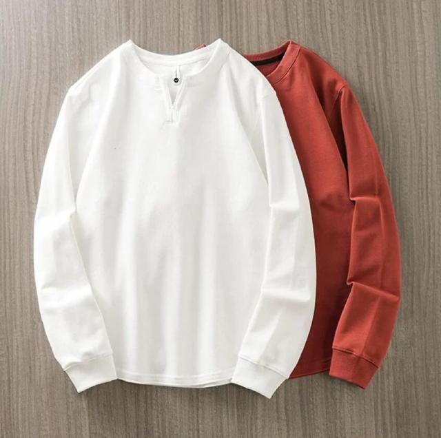 ・洗練されたデザインが魅力の「ヘンリーネック クルーネック メンズ ロングTシャツ」。綿の高品質な素材を使用し、柔らかな肌触りで快適な着心地を実現しています!