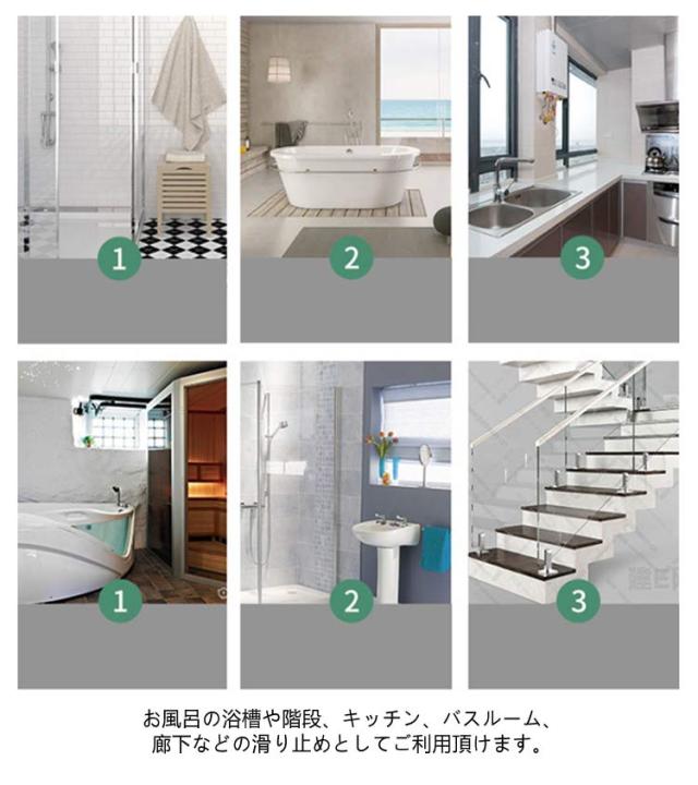 | 滑りやすくなった階段・フロアなどのスリップ事故の防止に! 表面には細かな凹凸加工が施されており、ズレにくく、素足で歩いても不快感がありません。 耐水性の高いPEVA素材で、水分の浸透を防止し、汚れても簡単に拭き取ることができます。 特別な道具も不要!台紙から剥がして必要な場所に貼るだけ! 糊残りしにくい糊を使っていますので、賃貸でもお使いいただけます。 お風呂の浴槽や階段、キッチン、バスルーム、廊下などの滑り止めとしてご利用頂けます。 | |