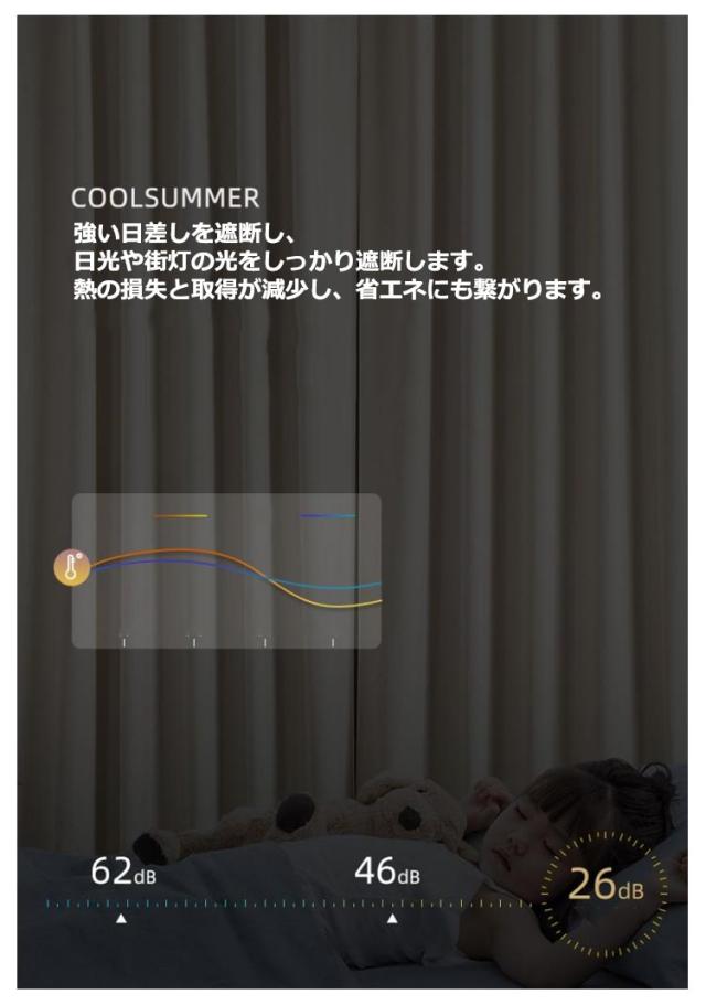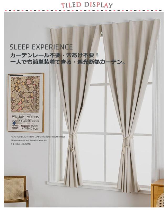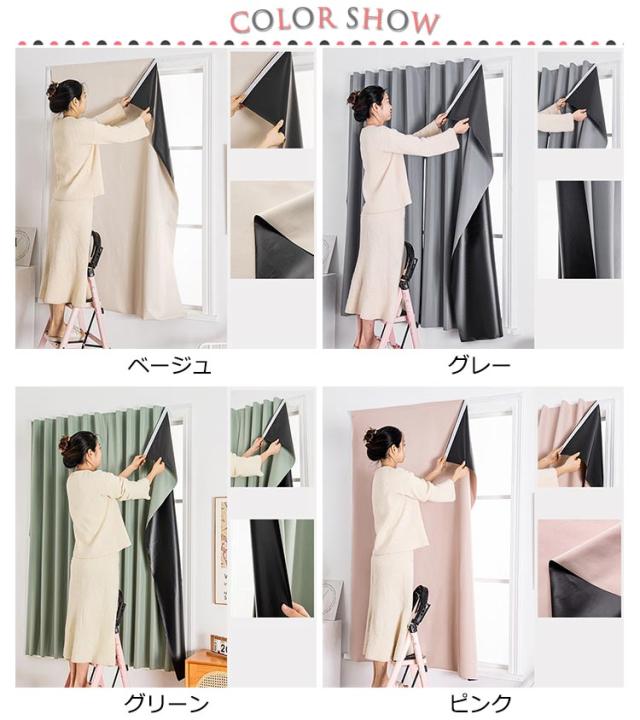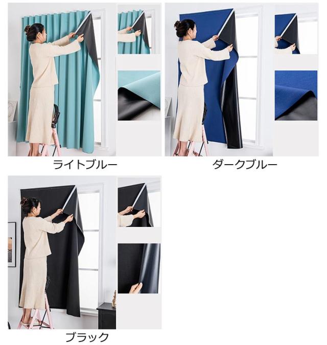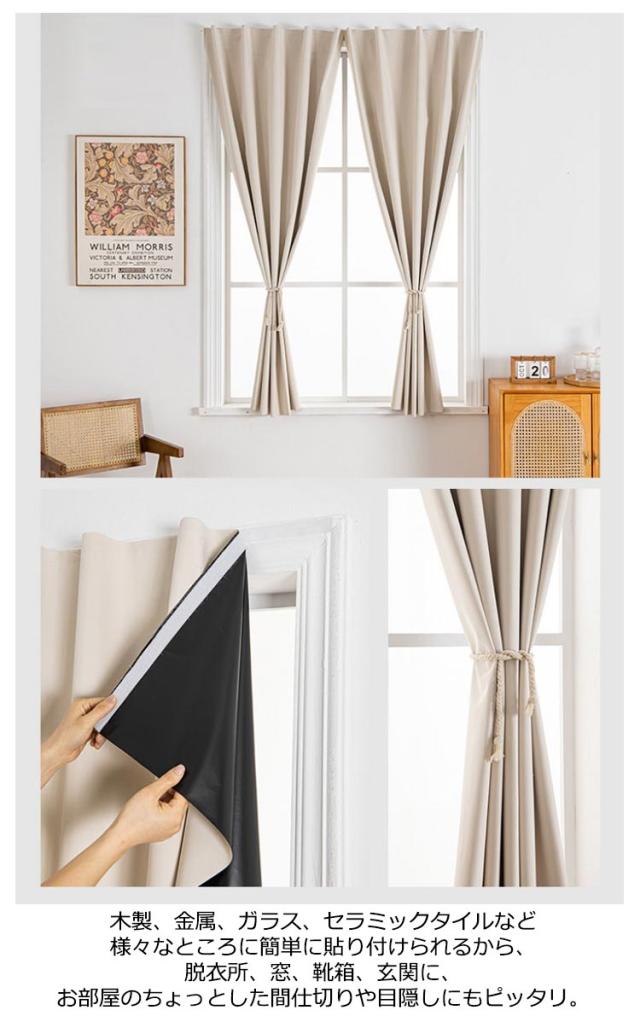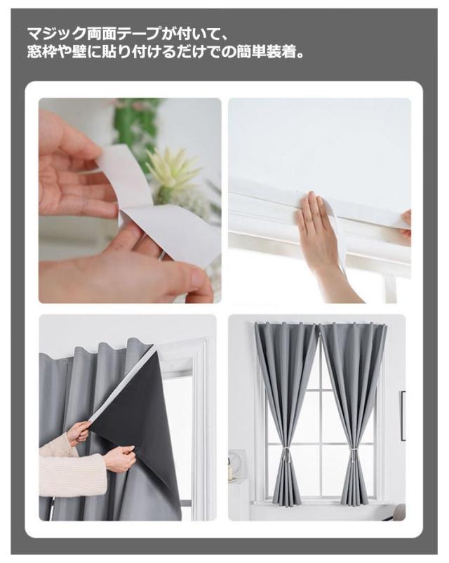 | 100%遮光 見た目もオシャレ、インテリアに合わせやすい豊富な7カラー展開。 カーテンレール不要・穴あけ不要! 一人でも簡単装着できる・遮光断熱カーテン。 マジック両面テープが付いて、窓枠や壁に貼り付けるだけでの簡単装着。 木製、金属、ガラス、セラミックタイルなど様々なところに簡単に貼り付けられるから、 脱衣所、窓、靴箱、玄関に、お部屋のちょっとした間仕切りや目隠しにもピッタリ。 強い日差しを遮断し、日光や街灯の光をしっかり遮断します。 熱の損失と取得が減少し、省エネにも繋がります。 室外陽光阻まれて、たとえ猛暑が続くても、薄暗く涼しい雰囲気を持っています。 100%遮光断熱uvカット加工でフローリングや家具の日焼け防止もおすすめ。 | |