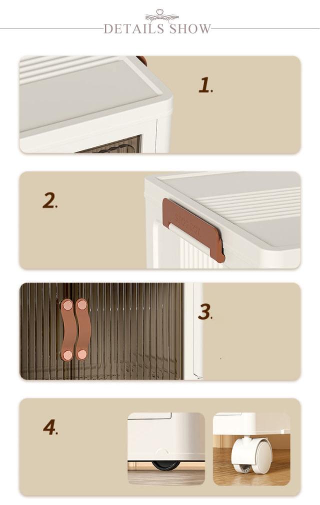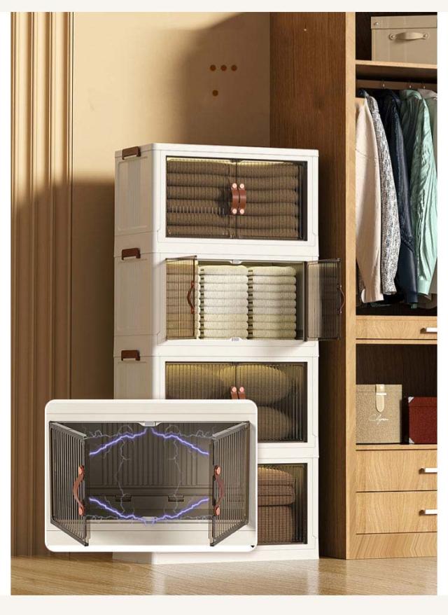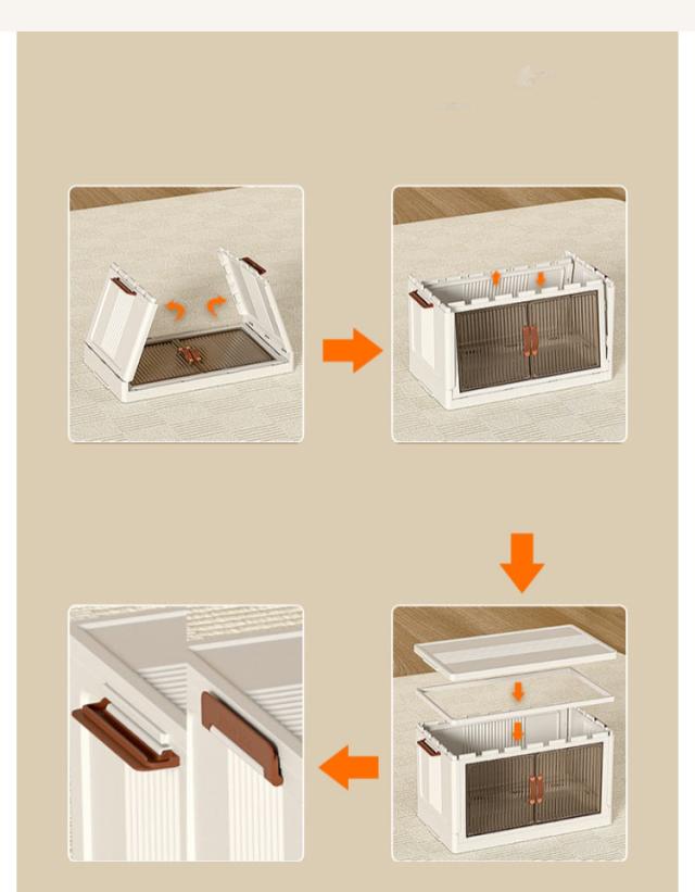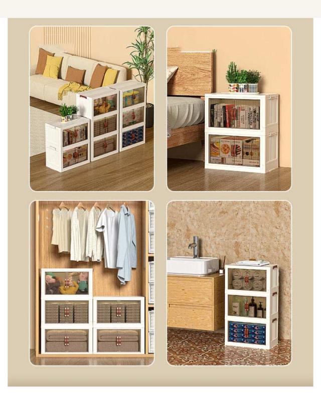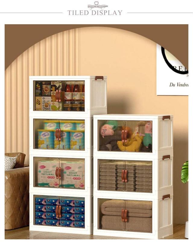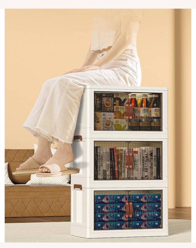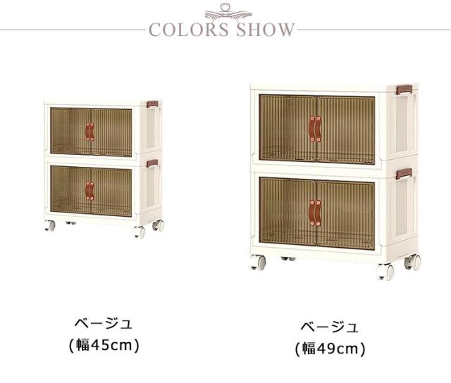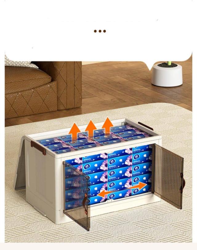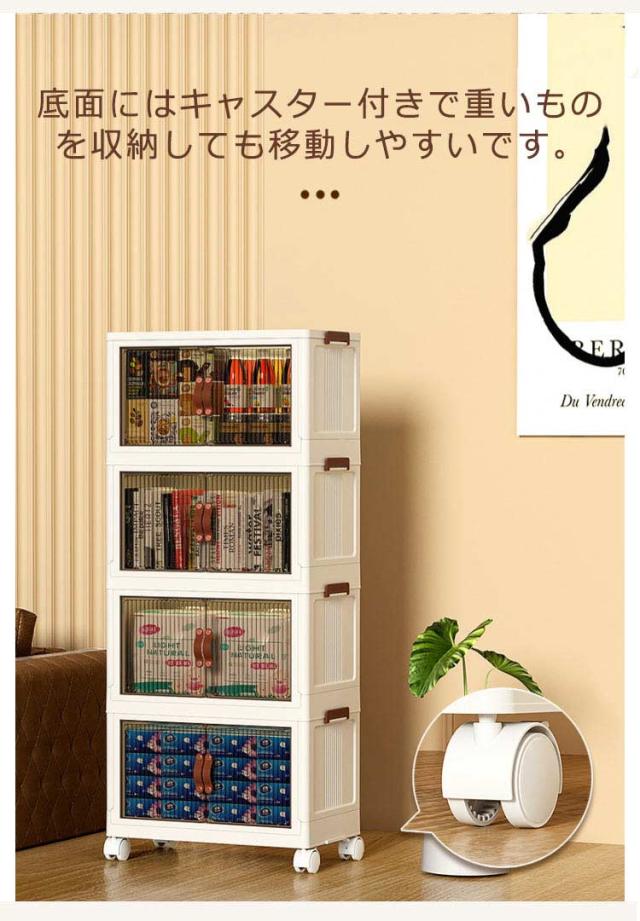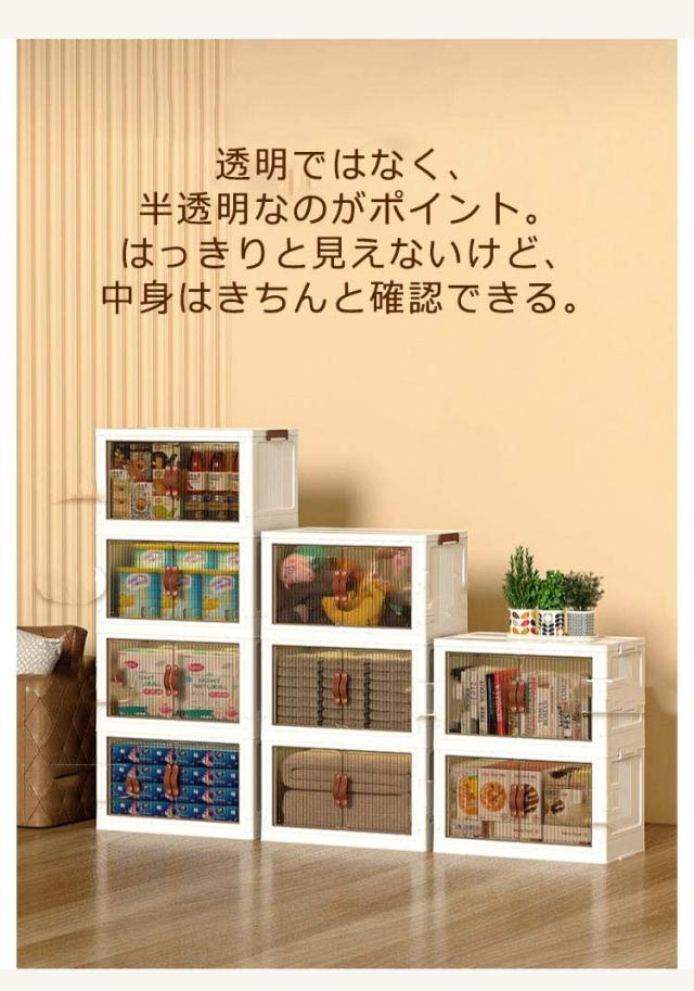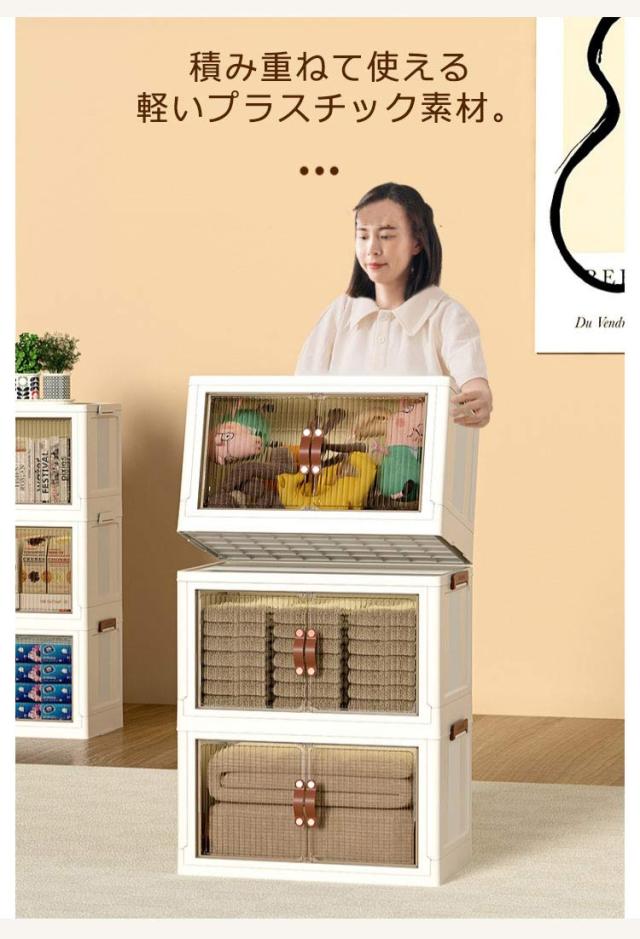 | ・キャスター付きの前開き折りたたみ収納ボックス ・底面にはキャスター付きで重いものを収納しても移動しやすいです。 ・積み重ねて使える軽いプラスチック素材。 ・透明ではなく、半透明なのがポイント。はっきりと見えないけど、中身はきちんと確認できる。 ・リビングにおいても違和感なくインテリアに馴染んでくれます。 ・使わない時はすっきりとコンパクトに折り畳めるのがポイント。 | |