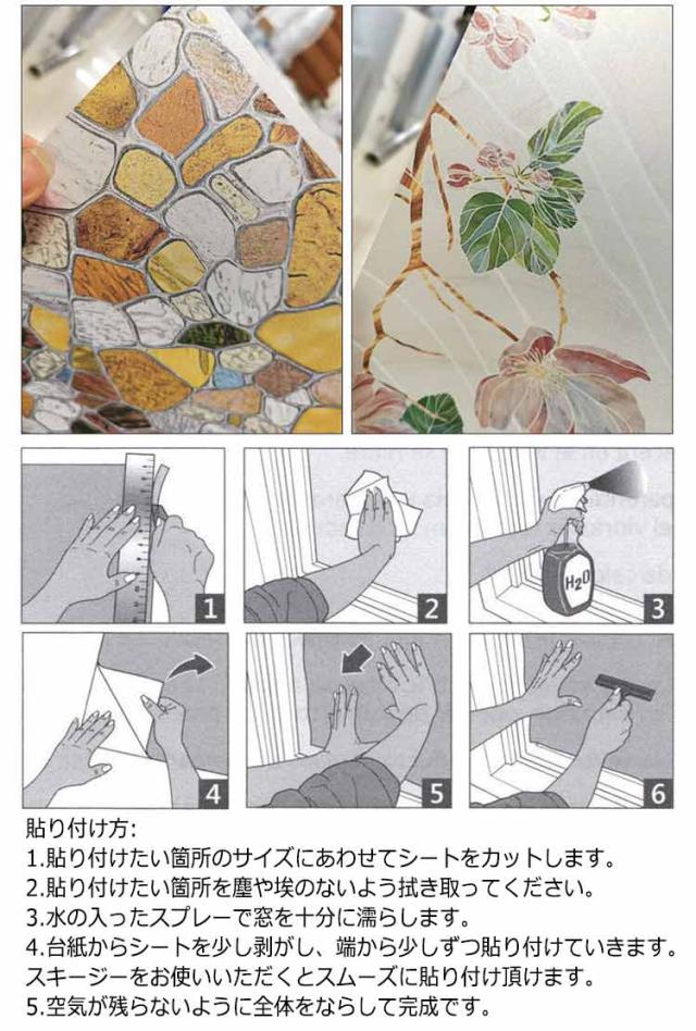 | 何度でも貼り直しできるガラスフィルムです。【ステンドグラス風】 剥がすときはのり跡が残らないので賃貸住宅でも気軽にご使用いただけます。 目隠しの同時に、部屋が暗くなりません。日光の眩しさが軽減して可視光線だけを室内に取り入れるので、パソコンが見えやすくなり、勉強と仕事の効率もかなり上がります。 鮮やかなカラーが窓をおしゃれで楽しい雰囲気にしてくれます。 貼り付け方: 1.貼り付けたい箇所のサイズにあわせてシートをカットします。 2.貼り付けたい箇所を塵や埃のないよう拭き取ってください。 3.水の入ったスプレーで窓を十分に濡らします。 4.台紙からシートを少し剥がし、端から少しずつ貼り付けていきます。スキージーをお使いいただくとスムーズに貼り付け頂けます。 5.空気が残らないように全体をならして完成です。 | |