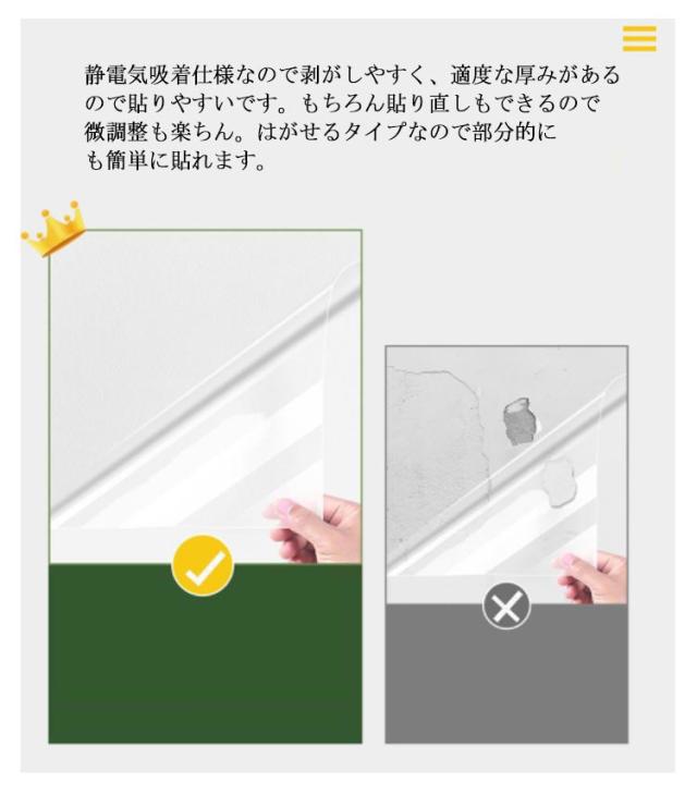 | 【目立ちにくい】PPを使用、無毒エコ素材なのでペットが舐めても安心!目立ちにくく、防水性、耐酸性、耐油性に優れており、ペットの爪とぎ・引掻き・子供の落書きなどの防止にお役に立てるシートです。おしゃれで違和感なくご使用いただけます。 【良好な粘着力&綺麗に貼りやすい】静電気吸着仕様なので剥がしやすく、適度な厚みがあるので貼りやすいです。もちろん貼り直しもできるので微調整も楽ちん。はがせるタイプなので部分的にも簡単に貼れます。 【防水&耐熱&お掃除簡単】保護シートは耐熱性のPP接触紙で制作、PP素材で防水効果。汚れた場合はすぐに拭き取ることができるので、お手入れにとても便利です。防水機能により、防カビにもなる長持ちの壁紙です。 【貼れる面&適用場所】壁、ソファー、椅子、机の脚、ベッド、柱、扉、など細かな所にも簡単に貼れます、家具の周りで猫の爪ぎを防ぐことができます。ソファー、家具、テーブルの足、壁の角、ドアはすべてご利用いただけます。持ち家だけではなく、賃貸、社宅、新築でも安心に使えます。 | |
