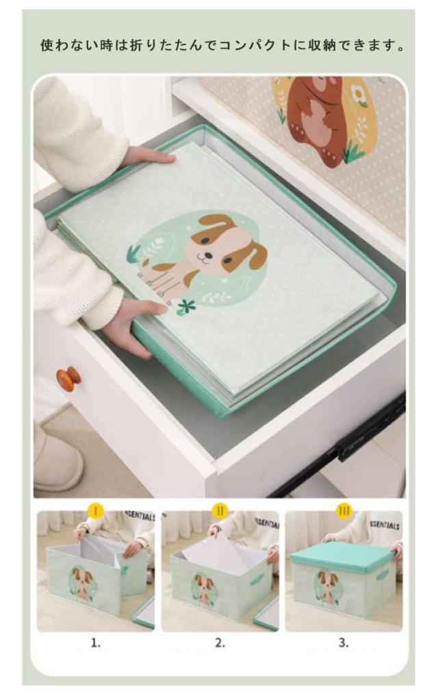 | リビングや子供部屋のおもちゃなどの片付けや整理整頓に便利な折りたたみ収納ボックス♪ 持ち手付きなので持ち運びが簡単に出来ます。 沢山物が入り、スタッキングもできます。 使わない時は折りたたんでコンパクトに収納できます。 衣類、書類、おもちゃ、生活雑貨などを整理でき、用途が広がる。 可愛い収納ボックスで家の物を収納することによって、部屋の整理整頓と美しさが保てられます。 | |