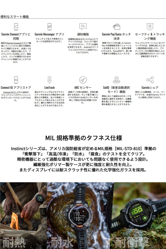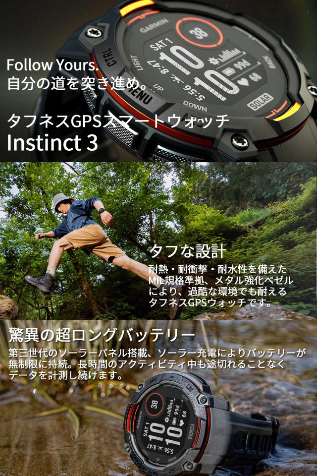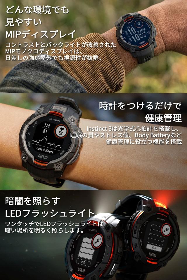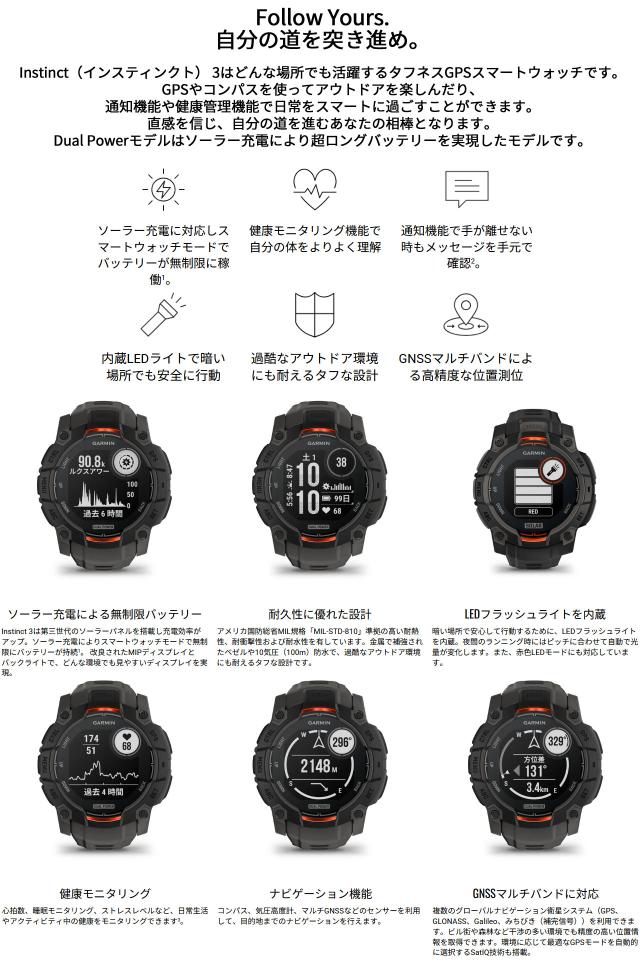 タフネスGPSスマートウォッチ ガーミン インスティンクト3 GARMIN Instinct 3 Dual Power 50mm 010-02935-30 【取説サービス】 アウトドア マラソン ウォーキング トレイルラン 登山 ゴルフ スノーボード サーフィン Suica対応 血中酸素 通知機能