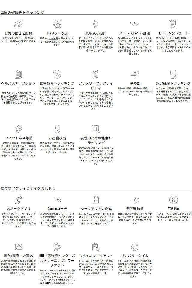 ■センサー:GPS、GLONASS、Galileo、みちびき(補完信号)、SatIQ(衛星自動選択モード)機能、Garmin Elevate光学式心拍計、血中酸素トラッキング、気圧高度計、コンパス、ジャイロセンサー、加速度計、温度計