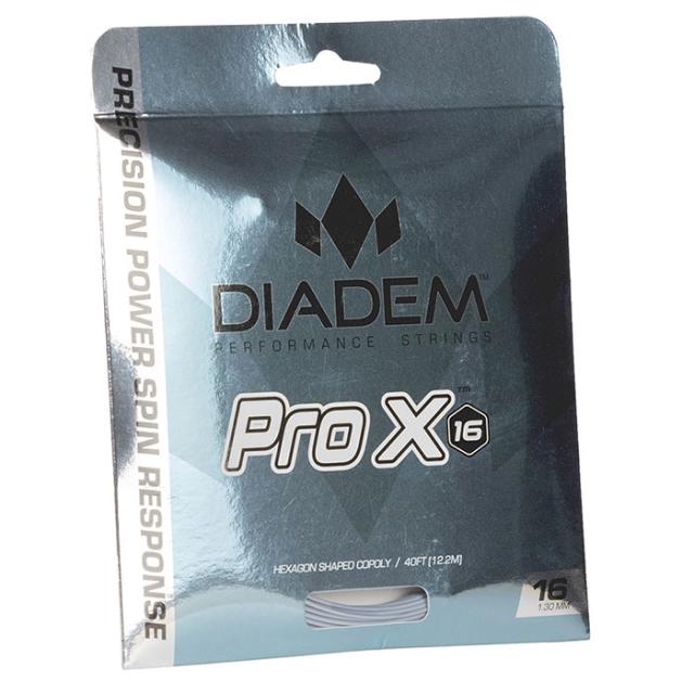 PRO Xは、ダイアデム製品の中で最もパワーがありしっかりとした打球感のストリングです。現役プロテニスプレーヤーの協力を得て設計されたこのポリストリングは、6角形の断面構造を持ち、硬めの打感に設計されています。この硬さから生み出すレスポンスの良さと、エッジの効いた形状からインパクト時にボールに噛みつくことで生み出される減速しないスピン性能を発揮します。