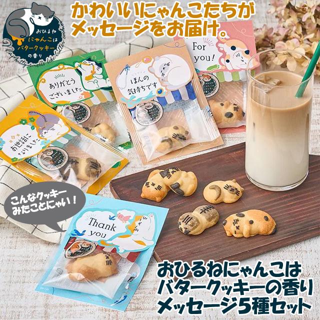 おひるねにゃんこはバタークッキーの香りメッセージ 5種セット メッセージ付きパッケージ クッキー お菓子 スイーツ にゃんこの形 猫 ネコ ねこ 書き込み台紙付き