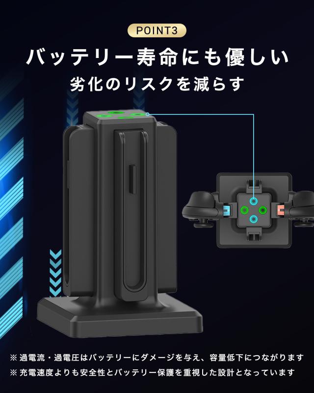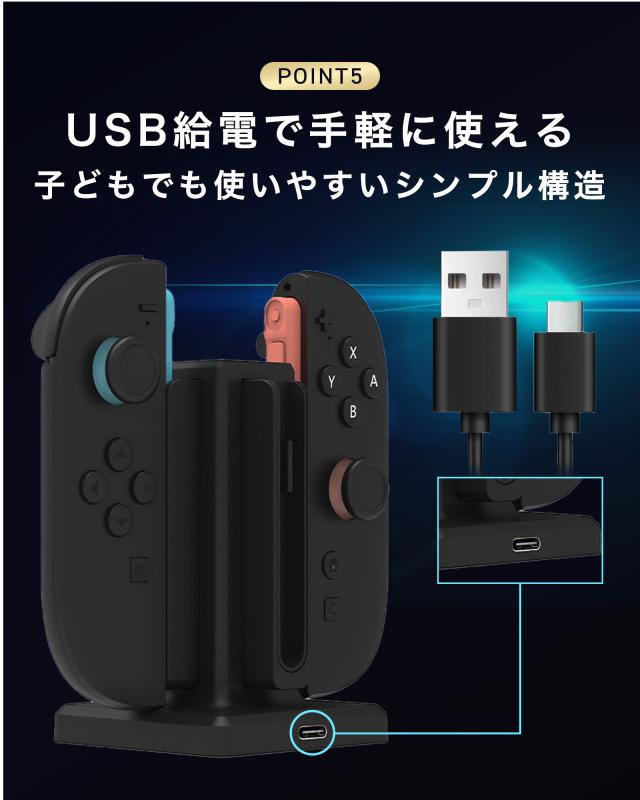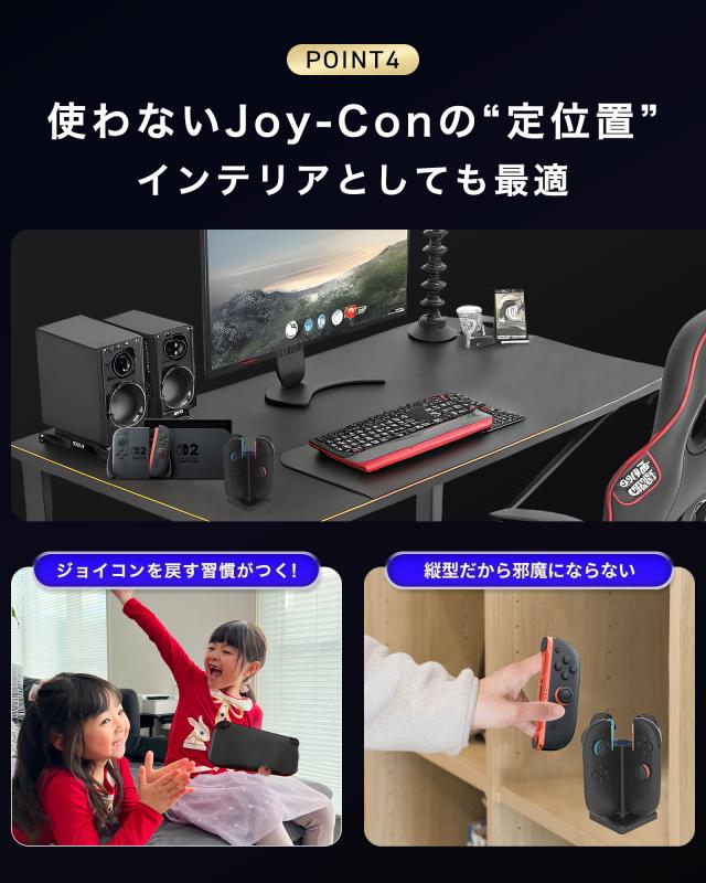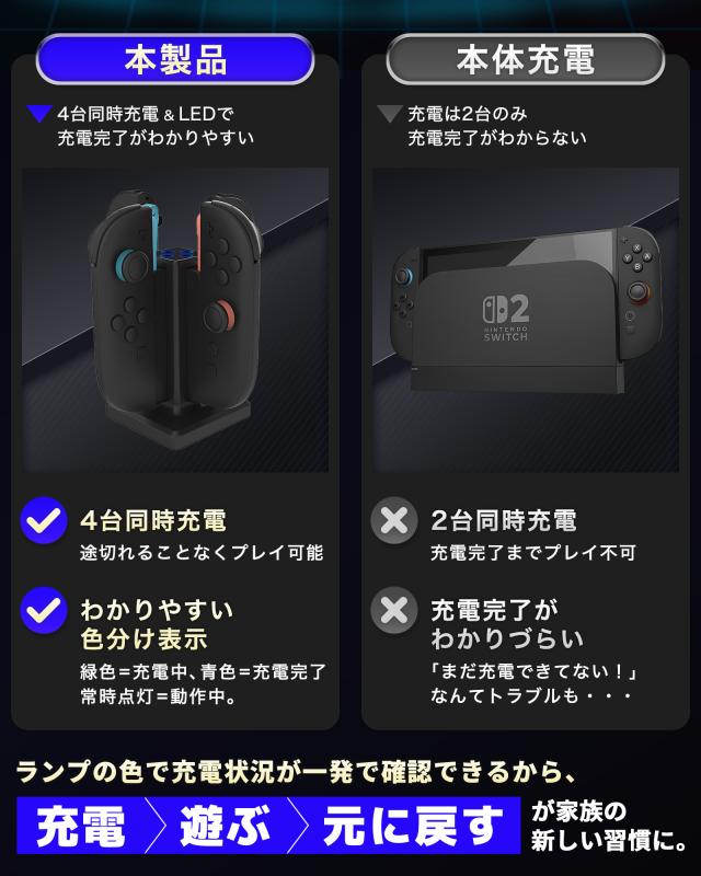 | 特徴 | 【 ついに登場!便利な充電スタンド 】 【 優れた5つの特徴 】 (1) 最大4本のJoy-Conを同時に充電できる便利さ (2) 差すだけでかんたんに充電できる操作性 (3) ひと目でわかるLEDランプ表示 (4) スッキリ置けるコンパクトな縦型デザイン (5) Joy-Conの収納場所にもなるから散らからない 【 4本まとめて充電!家族みんなのJoy-Conにぴったり 】 Joy-Conを最大4本まで同時に充電可能!家族や友だちとのゲームタイムを、いつでもすぐ始められます。 【 使い方はカンタン!差しこむだけでOK 】 Joy-Conをセットするだけで充電スタート!子どもでも手軽に使える、わかりやすくて便利な設計です 【 色でわかる!今の充電状態がすぐ見える 】 LEDランプの色で充電中や完了がすぐにわかるから、「今どれが使える?」と迷わずチェックできます。 【 場所をとらない!見た目もスッキリきれい 】 コンパクトな縦型デザインで、テレビの横や机のすみにもスッキリ設置。おしゃれでじゃまになりません。 【 片付けもできて一石二鳥!Joy-Conの定位置に 】 充電しながら収納もできるから、Joy-Conが散らからずにスッキリ。子どもでも自然に片付けられます。 |
