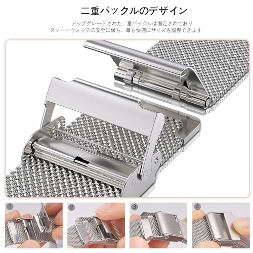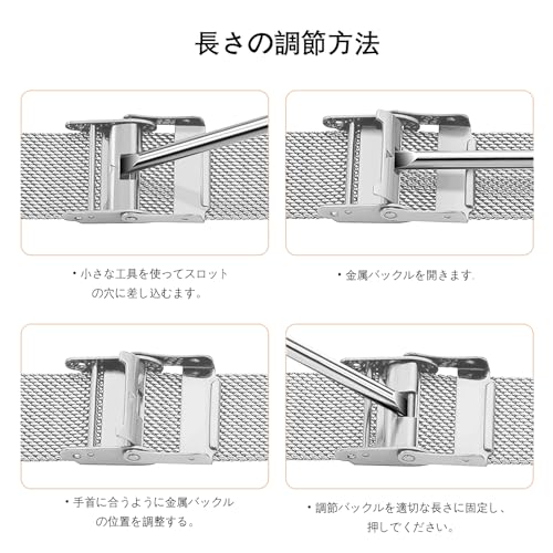 【長さ調節可能】強いバックルのデザインより、ステンレスメッシュベルトの脱落や緩みを防ぎ、長さを調整することにより、手首に合った位置にバンドを調整できます。ストラップを外さずに着脱が簡単。調節可能な金属ストラップは、取り付けと着用が簡単です。時計に正確かつ安全に取り付けることができ、取り付けは簡単で直接、ワンクリックで分解できます。 ストラップの長さを調整するのに役立つリンク取り外しツールをご用意しています。