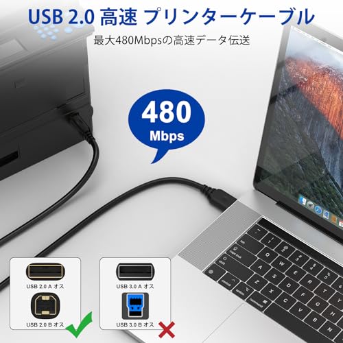 【高速データ転送&使いやすい】:USB ケーブル Type-Bは最大480 Mbpsの転送データ速度をサポートしており、USB 1.1(12 Mbps)とUSB 1.0(1.5 Mbps)などと下位互換性があります。また、ドライバーをインストールする必要がなし、挿すだけで認識可能です。プリンターとパソコンに接続し、すべてのファイルと写真をはっきりと印刷し、歪まないようにできます。WIFI接続より、もっと安定で使いやすいです。