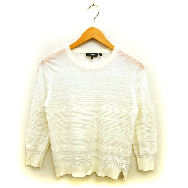 【中古】セオリー Theory サマーニット セーター リブ リネン混 ボーダー 透け感 クルーネック 長袖 S オフホワイト