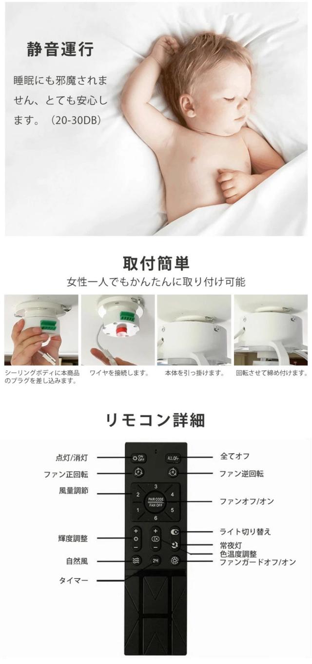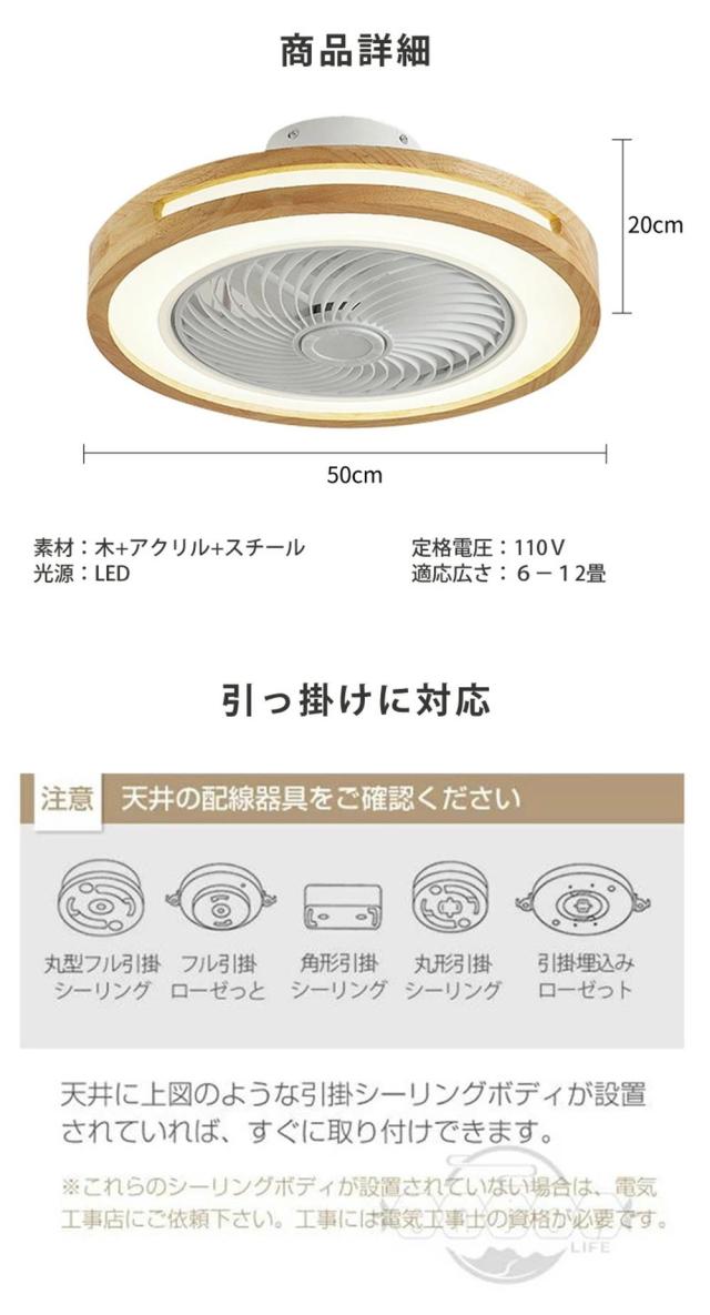 | ご注意 | ご購入前に天井の配線器具の確認をしてください。配線器具により取付け方が異なります。必ず天井の強度をご確認ください。 ●取付けアタッチメント:引掛埋込ローゼット、角型引掛シーリングボディなど ※引掛けが異なり、またフックも何センチの厚みがあり、シーリングのフックと配線器具の間に隙間が出る場合がございます。 ※適切な羽の高さ:床から220〜250cm ※リモコン付き(単4電池×2個必要※電池は付属していません) |