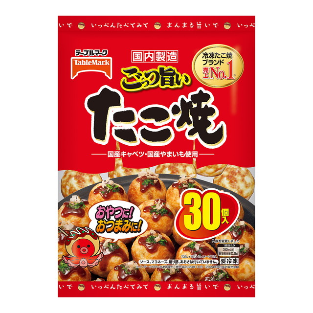 ごっつ旨いたこ焼30個がま〜るくなって新登場しました。釣鐘型から丸型となりより本格的なたこ焼をお楽しみいただけます。国産キャベツ国産やまいもを使用したふんわりとろ〜り食感の生地。北海道産真昆布使用の昆布だしを含む5種のだしを使っており生地のおいしさが自慢です。