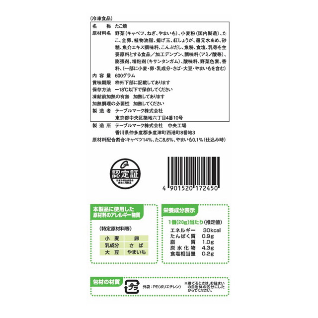 商品名 [冷凍] テーブルマーク ごっつ旨いたこ焼30個 600g×4袋 容量 600g×4袋 原材料名 野菜(キャベツ、ねぎ、やまいも)、小麦粉(国内製造)、たこ、全卵、植物油脂、揚げ玉、紅しょうが、還元水あめ、砂糖、魚介エキス調味料、こんぶだし、魚粉、食塩、乳等を主要原料とする食品/加工デンプン、調味料(アミノ酸等)、膨張剤、増粘剤(キサンタンガム)、酸味料、野菜色素、香料、(一部に小麦・卵・乳成分・さば・大豆・やまいもを含む) アレルギー特定原材料 小麦、乳、卵 賞味期限 商品の発送時点で、60日以上あるものをお届けいたします 保存方法 -18℃以下で保存してください。